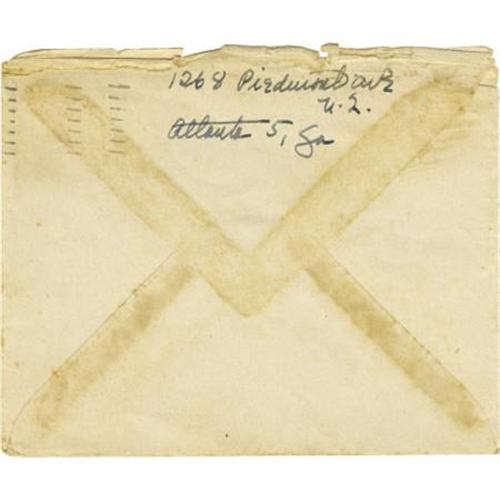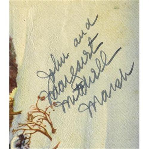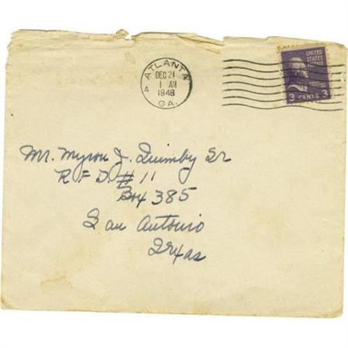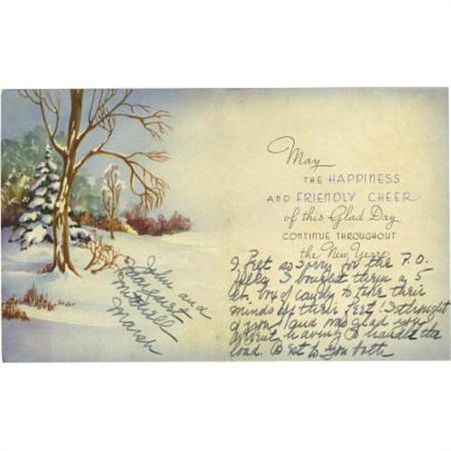 <B>Margaret Mitchell: Signed Christmas Card</B></I>, bifolia, 9.25" x 5.5", Atlanta, Georgia, includes envelope dated December 21, 1948 and addressed to Mr. Myron Quimby in San Antonio, Texas, blue ink. An American novelist born in Georgia, Mitchell won the Pulitzer Prize for her epic book <I>Gone With the Wind,</B></I> about life in the South during the Civil War era. A Christmas card signed as "<I>Margaret Mitchell Marsh</B></I>". She writes: "<I>I felt so sorry for the P.O. folks. I bought them a 5lb. Box of candy to take their minds off their feet. I thought of you and was glad you weren't having to handle the load.Best to you both</B></I>". Mitchell died on August 11, 1949, after being struck by an off-duty cab driver, making this her last Christmas. Fine condition.<BR><BR><b>Shipping:</b> Flat Material, Small (<a target="_blank" href="http://www.heritageauctions.com/common/shipping.php">view shipping information</a>)
