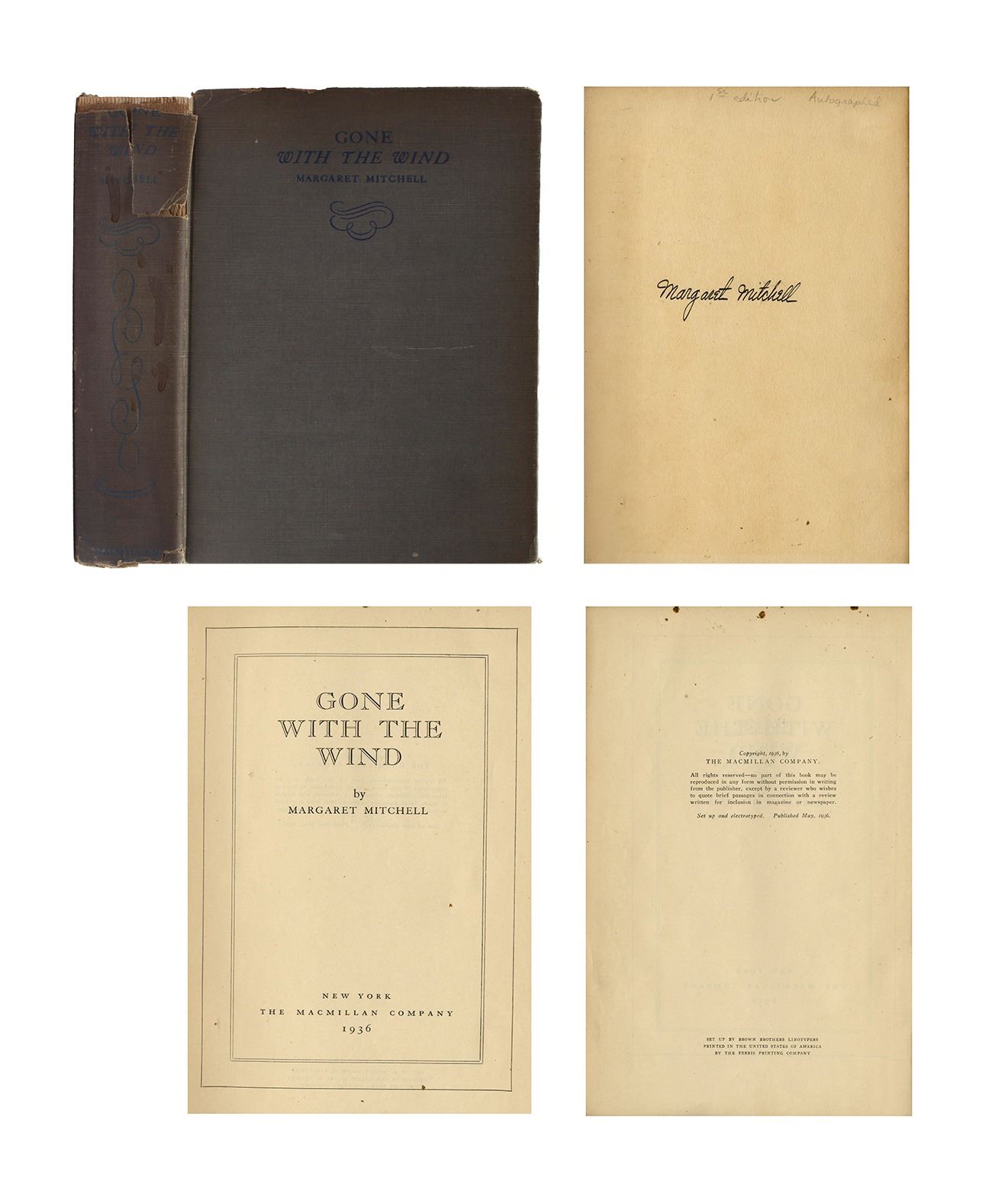 Margaret Mitchell signed first edition, first printing of her Pulitzer prize-winning novel ''Gone With the Wind'', which inspired the Academy award-winning film of the same name. Elegantly signed ''Margaret Mitchell'' on the front free endpaper in black ink. New York: The MacMillan Co., 1936, with the incorrect publishing date of ''May, 1936'' on the copyright page identifying the first printing. Bound in ''Confederate grey'' cloth boards, book measures 6'' x 8.75''. Minor toning and foxing, separation starting along rear joint, and some damage to backstrip with piece torn (though still present) and staining. Overall very good condition.