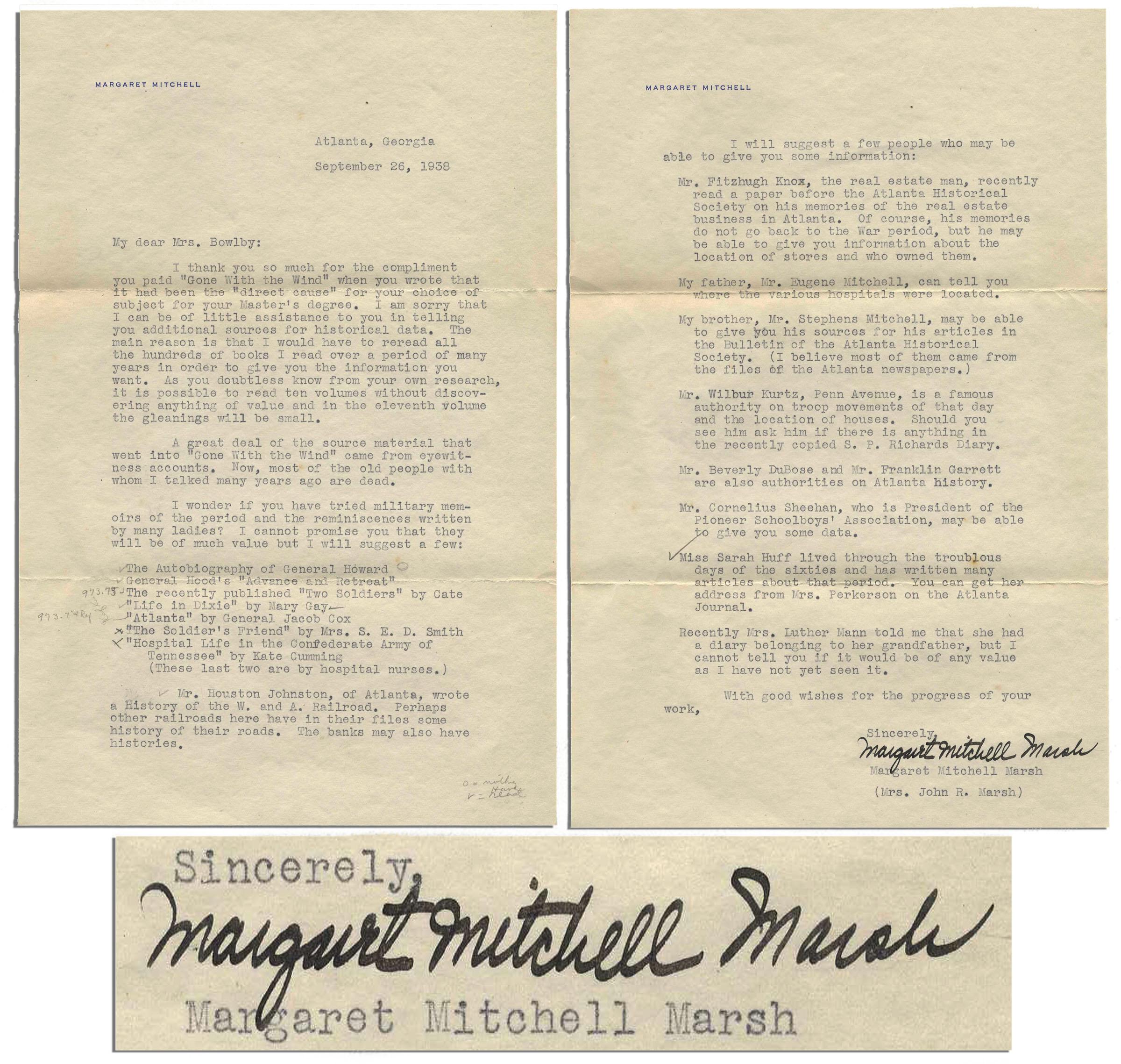 Fantastic typed letter signed by Margaret Mitchell regarding sourcing her novel ''Gone With the Wind.'' Letter dated 26 September 1938 on Mitchell's personal stationery is written to an Elizabeth Bowlby, a woman working upon her Master's degree who apparently asked Mitchell for references in writing the novel. In part, ''…I thank you so much for the compliment you paid 'Gone With the Wind' when you wrote that it had been the 'direct cause' for your choice of subject for your Master's degree…A great deal of the source material that went into 'Gone With the Wind' came from eyewitness accounts. Now, most of the old people with whom I talked many years ago are dead. I wonder if you have tried military memoirs of the period and the reminiscences written by many ladies? [Mitchell then recommends several] I will suggest a few people who may be able to give you some information:…My father, Mr. Eugene Mitchell, can tell you where the various hospitals were located. My brother, Mr. Stephens Mitchell, may be able to give you his sources for his articles in the Bulletin of the Atlanta Historical Society…Miss Sarah Huff lived through the troublous days of the sixties and has written many articles about that period…'' Lengthy two page letter (on two sheets) is signed very boldly, ''Margaret Mitchell Marsh'' in black fountain pen. Pages measuring 7.25'' x 11'' are in near fine condition with some discreet pencil notations and mailing folds. Accompanied by original mailing envelope with Mitchell's printed Atlanta address. Also accompanied by two letters to Bowlby from the Atlanta Historical Society.