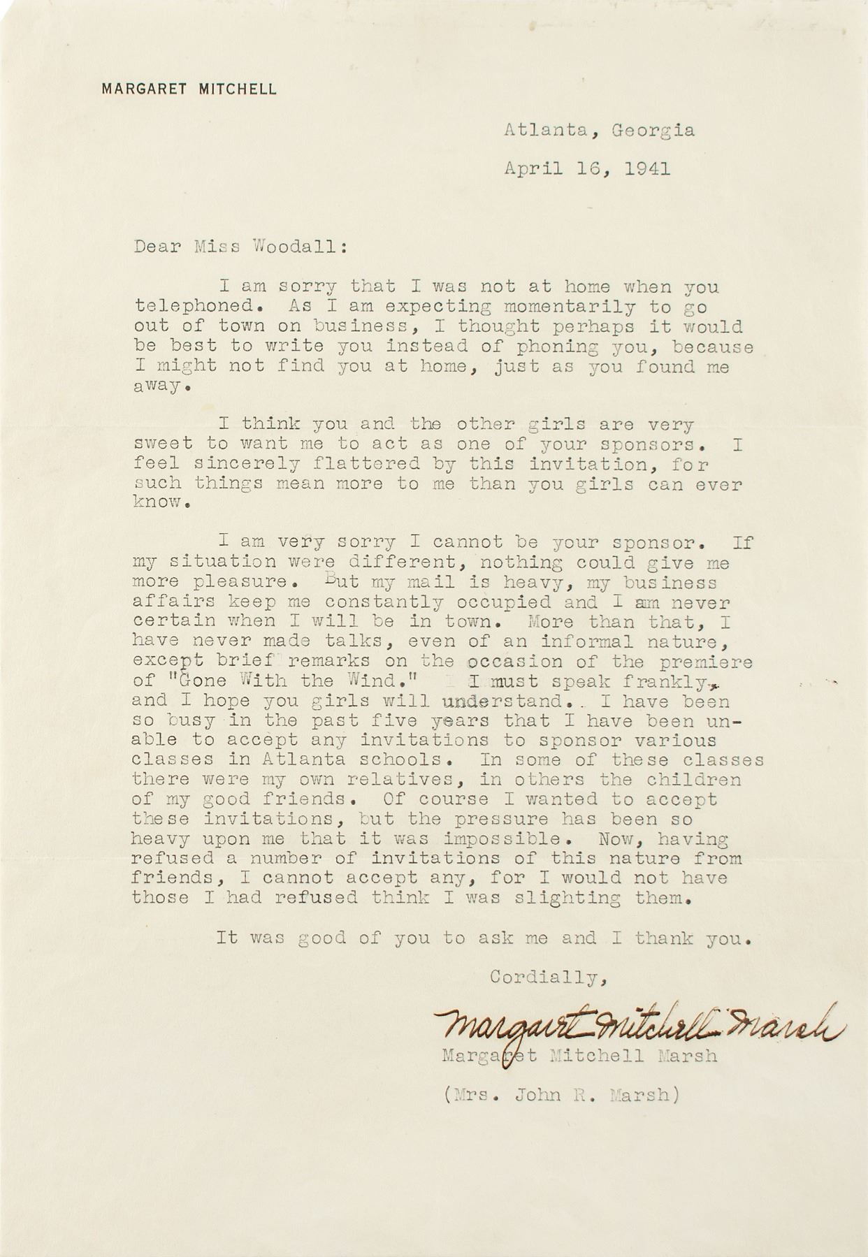 TLS signed "Margaret Mitchell Marsh," one page, 7.25 x 10.5, personal letterhead, April 16, 1941. Mitchell writes to Miss Woodall, referencing the screen version of her best-seller while demonstrating her famously humble and self-effacing disposition. In part: "I thank you and the other girls are very sweet to want me to act as one of your sponsors. I feel sincerely flattered by this invitation, for such things mean more to me than you girls can ever know. I am very sorry I cannot be your sponsor. If my situation were different, nothing could give me more pleasure. But my mail is heavy, my business affairs keep me constantly occupied and I am never certain when I will be in town. More than that, I have never made talks, even of an informal nature, except brief remarks on the occasion of the premiere of 'Gone with the Wind.' I must speak frankly, and I hope you girls will understand. I have been so busy in the past five years that I have been unable to accept any invitations to sponsor various classes in Atlanta schools." In fine condition. A most interesting association with the timeless screen adaptation of Micthell's legendary, and only, novel! Accompanied by a full letter of authenticity from PSA/DNA.