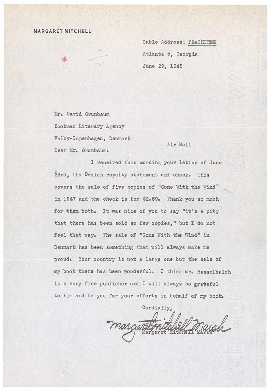American author (1900–1949) whose single novel, Gone With the Wind, became one of the best-sellers of all time and spawned one of the most fabled movies in Hollywood history. She died after being struck by a speeding car at the age of 48. TLS signed “Margaret Mitchell Morse,” one page, 7.25 x 10.5, personal letterhead, June 29, 1948. Letter to David Grunbaum at the Bookman Literary Agency, in Copenhagen, Denmark. In full: “I received this morning your letter of June 23rd, the Danish royalty statement and check. This covers the sale of five copies of ‘Gone With the Wind’ in 1947 and the check is for $2.59. Thank you so much for them both. It was nice of you to say ‘it’s a pity that there has been sold so few copies,’ but I do not feel that way. The sale of ‘Gone With the Wind’ in Denmark has been something that will always make me proud. Your country is not a large one but the sale of my book there has been wonderful. I think Mr. Hasselbalch is a very fine publisher and I will always be grateful to him and to you for your efforts in behalf of my book.” In fine condition, with a small star-shaped rubber stamp to upper blank area, and some mild edge toning, primarily along top.