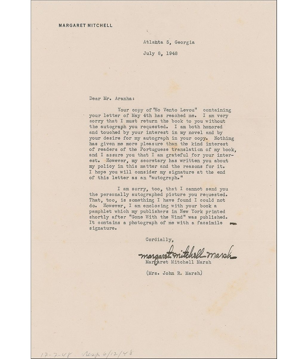 American author (1900–1949) whose single novel, Gone With the Wind, became one of the best-sellers of all time and spawned one of the most fabled movies in Hollywood history. She died after being struck by a speeding car at the age of 48. TLS signed “Margaret Mitchell Marsh,” one page, 7.25 x 10.5, personal letterhead, July 8, 1948. In full: “Your copy of ‘Eo Vento Levou’ containing your letter of May 4th has reached me. I am very sorry that I must return the book to you without the autograph you requested. I am both honored and touched by your interest in my novel and by your desire for my autograph in your copy. Nothing has given me more pleasure than the kind interest of readers of the Portuguese translation of my book, and I assure you that I am grateful for your interest. However, my secretary has written you about my policy in this matter and the reasons for it. I hope you will consider my signature at the end of this letter as an ‘autograph.’ I am sorry, too, that I cannot send you the personally autographed picture you requested. That, too, is something I have found I could not do. However, I am enclosing with your book a pamphlet which my publishers in New York printed shortly after ‘Gone With the Wind’ was published. It contains a photograph of me with a facsimile signature.” Pencil notation to bottom edge and some scattered light toning, otherwise fine condition. When Mitchell wrote Gone With the Wind, she had no idea of the sensation it would become. It was an instant bestseller, selling over 1,000,000 copies within the first six months of its publication, and she became so overwhelmed by the countless requests that she received to autograph copies of her novel that less than a year after its publication, she vowed not to sign any more, not even for close friends or relatives.