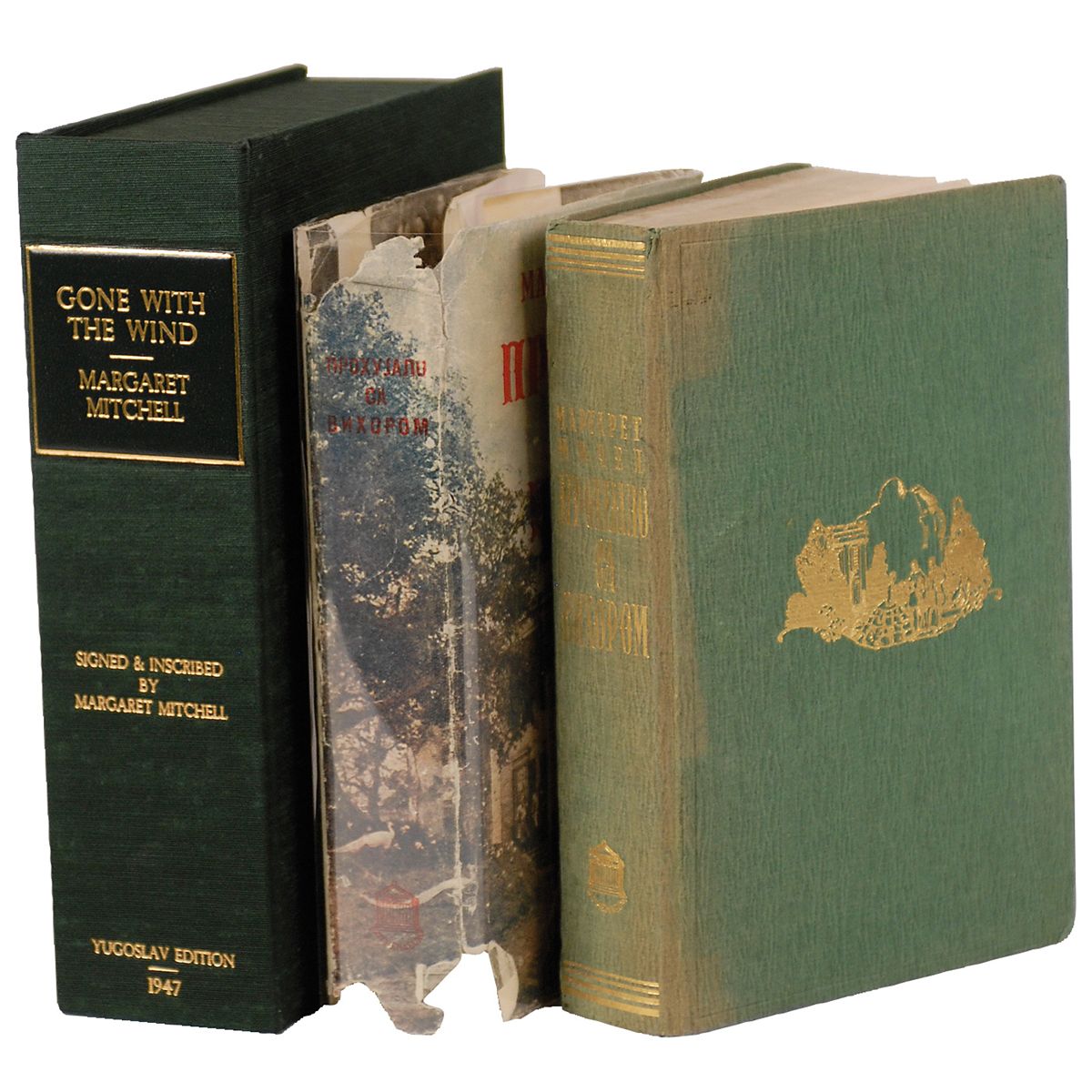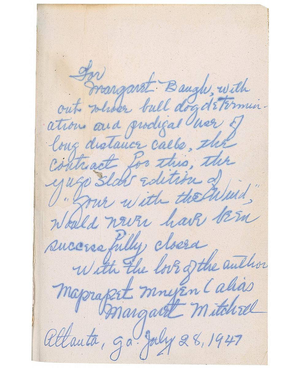 Signed book: Gone With the Wind. First Yugoslavian edition. Yugoslavia: 1946. Hardcover with dustjacket, 5.5 x 8.25, 1038 pages. Signed and inscribed on the first free end page to her personal secretary, “For Margaret Baugh, without whose bull dog determination and prodigal use of long distance calls, the contract for this, the Yugoslav edition of 'Gone With the Wind,' would never have been successfully closed. With the love of the author, Maprapet Mnyen (alias Margaret Mitchell Atlanta, Ga. July 28, 1947.” Book is housed in a dark green silk faille custom clamshell case with black leather label stamped with gilt titles. Book condition: G-/G+. Green paper-covered boards with stamped gilt lettering and illustration; soiling/stains and discoloration to exterior and feps; heavy water damage; front hinge beginning to split; rear hinge split, exposing binding cloth; shelf-cocked; last few pages loose; pencil notations to front pastedown. Dust jacket in protective plastic sheet; chips/tears and creases along edges and folds; rear flap split along ¾ of fold; front flap split along 1/3 of fold; water-damaged and stained. Case in F condition.