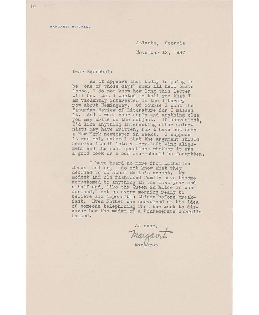 TLS signed in pencil, “Margaret,” one page, 7 x 11, personal letterhead, November 12, 1937. Letter to Herschel Brickell, a noted book reviewer from Mississippi who served on the New York Herald Tribune book section and who, at the time of this correspondence, was a reviewer for the New York Evening Post. In part: “As it appears that today is going to be ‘one of those days’ when all hell busts loose, I do not know how long this letter will be. But I wanted to tell you that I am violently interested in the literary row about Hemingway. Of course I want the Saturday Review of Literature for I missed it. And I want your reply and anything else you may write on the subject. If convenient, I’d like anything interesting other columnists may have written, for I have not seen a New York newspaper in weeks…I have heard no more from Katharine Brown, and so, I do not know what they decided to do about Belle's accent. My modest and old fashioned family have become accustomed to anything in the last year and a half and, like the Queen in 'Alice in Wonderland,' get up every morning ready to believe six impossible things before breakfast. Even Father was convulsed at the idea of someone telephoning from New York to discover how the madam of a Confederate bordello talked." In fine condition.