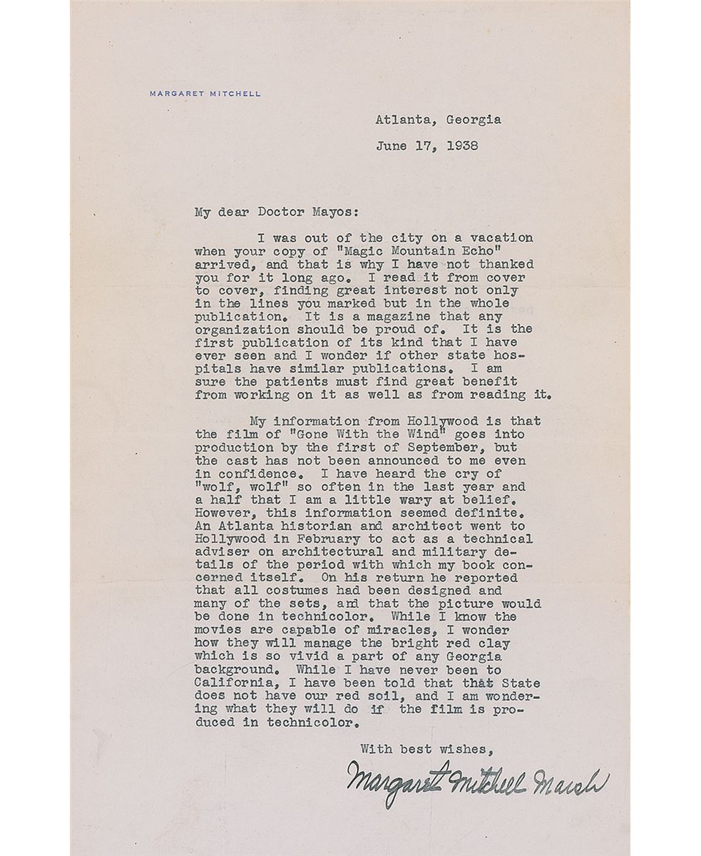 TLS signed “Margaret Mitchell Marsh,” one page, 7 x 11, personal letterhead, June 17, 1938. Letter to psychiatrist Dr. C. E. Mayos. In part: “My information from Hollywood is that the film of ‘Gone With the Wind’ goes into production by the first of September, but the cast has not been announced to me even in confidence. I have heard the cry of ‘wolf, wolf’ so often in the last year and a half that I am a little wary at belief. However, this information seemed definite. An Atlanta historian and architect went to Hollywood in February to act as a technical adviser on architectural and military details of the period with which my book concerned itself. On his return he reported that all costumes had been designed and many of the sets, and that the picture would be done in technicolor. While I know the movies are capable of miracles, I wonder how they will manage the bright red clay which is so vivid a part of any Georgia background. While I have never been to California, I have been told that that State does not have our red soil, and I am wondering what they will do if the film is produced in technicolor.” In fine condition, with intersecting folds (one vertical fold passing through a single letter of the signature).
