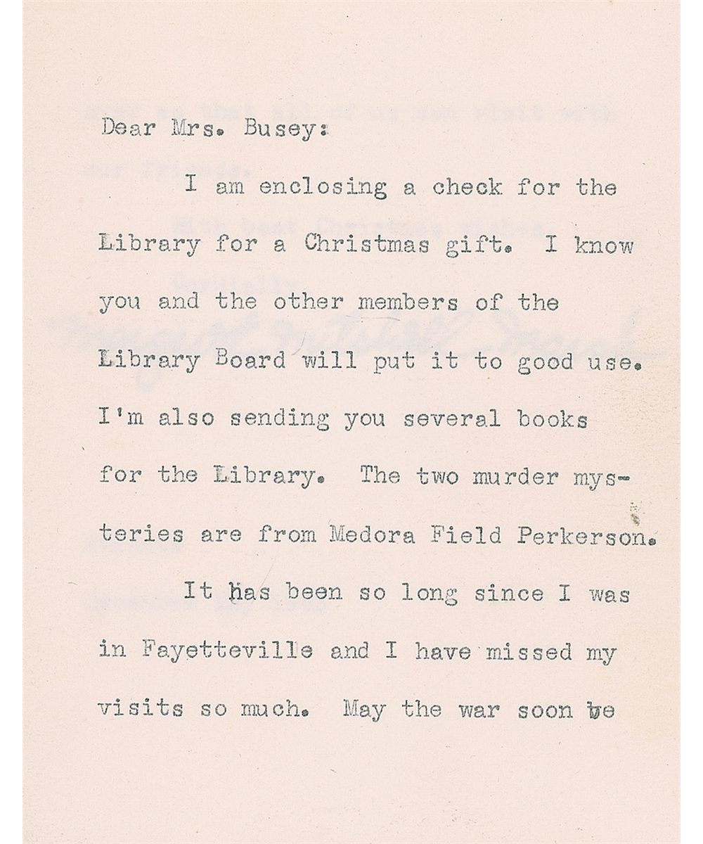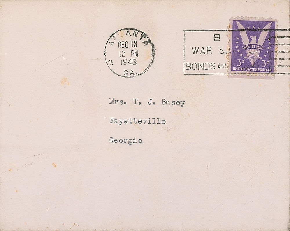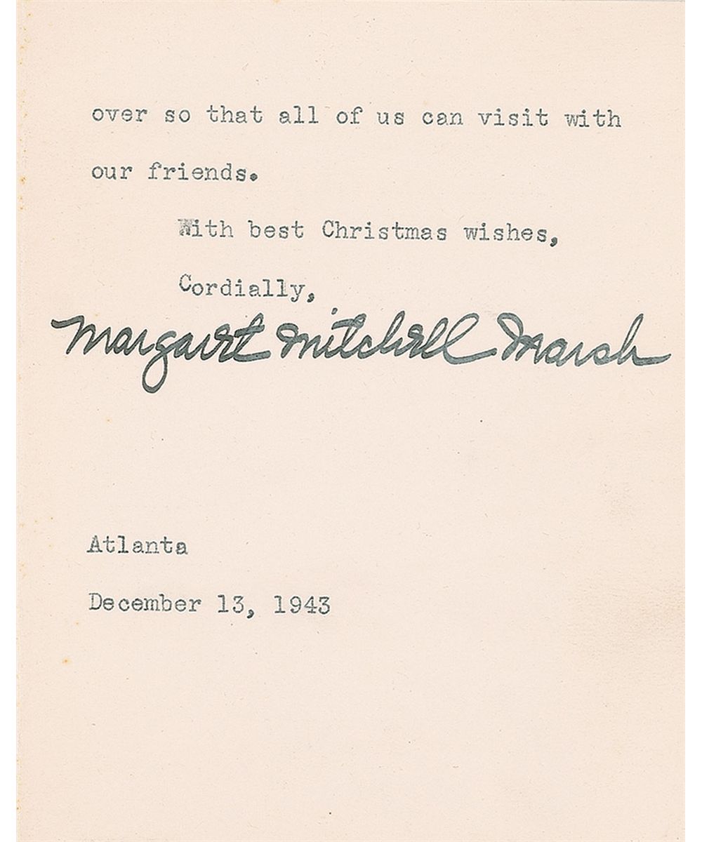 TLS signed “Margaret Mitchell Marsh,” two pages on two adjoining sheets, 4 x 5, postmarked December 13, 1943. Letter to Mrs. T. J. Busey of Fayetteville, Georgia. In part: “I am enclosing a check for the Library for a Christmas gift…I’m also sending you several books for the Library. The two murder mysteries are from Medora Field Perkerson.” In very fine condition. Accompanied by the original mailing envelope. A choice letter with a nice association to a library in her home state.