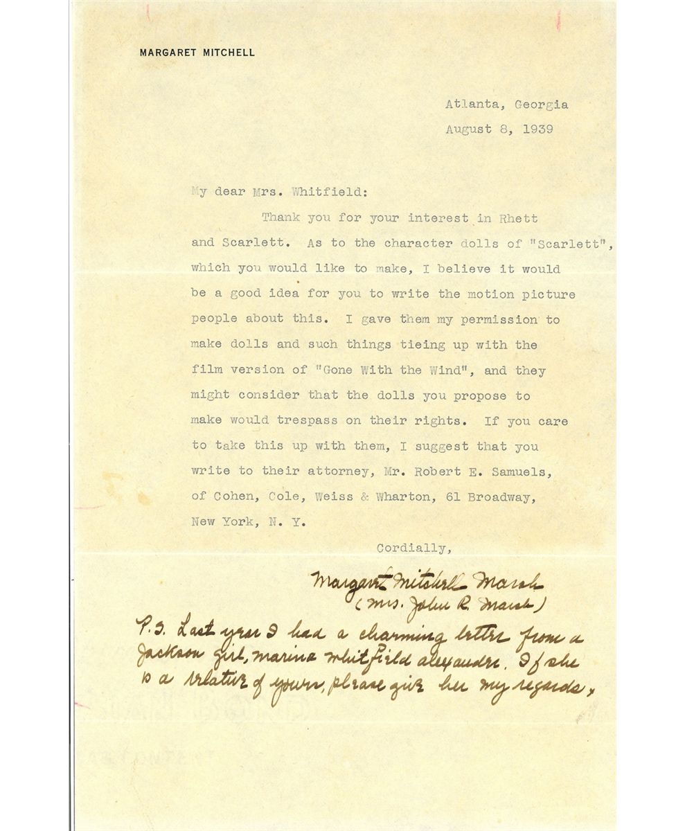 "Character dolls of 'Scarlett' Margaret Mitchell Typed Letter Twice Signed. One page, 7" x 10.75", Atlanta, Georgia; August 8, 1939. Writing to a Mrs. Whitfield, the American author expresses her concerns about potential copyright infringement: "As to the character dolls of 'Scarlett' which you would like to make, I believe it would be a good idea for you to write the motion picture people about this .... they might consider that the dolls you propose to make would trespass on their rights." Signed "Margaret Mitchell Marsh", adding a second signature beneath, "Mrs. John R. Marsh". With a lengthy holograph post script: "Last year I had a charming letter from a Jackson girl, Marina Whitfield Alexander. If she is a relative of yours, please give her my regards." Flattened folds and just a touch of toning.