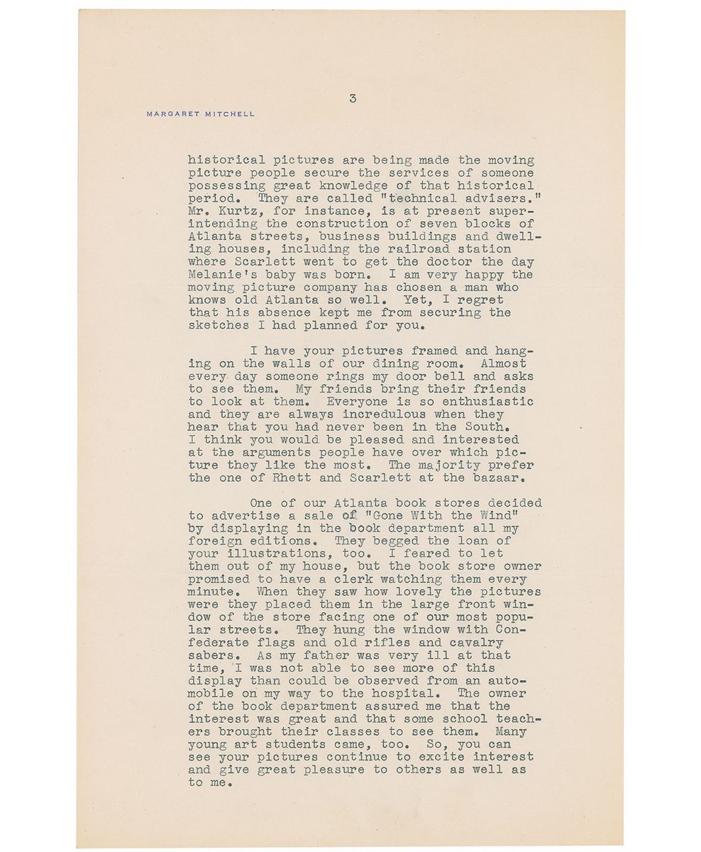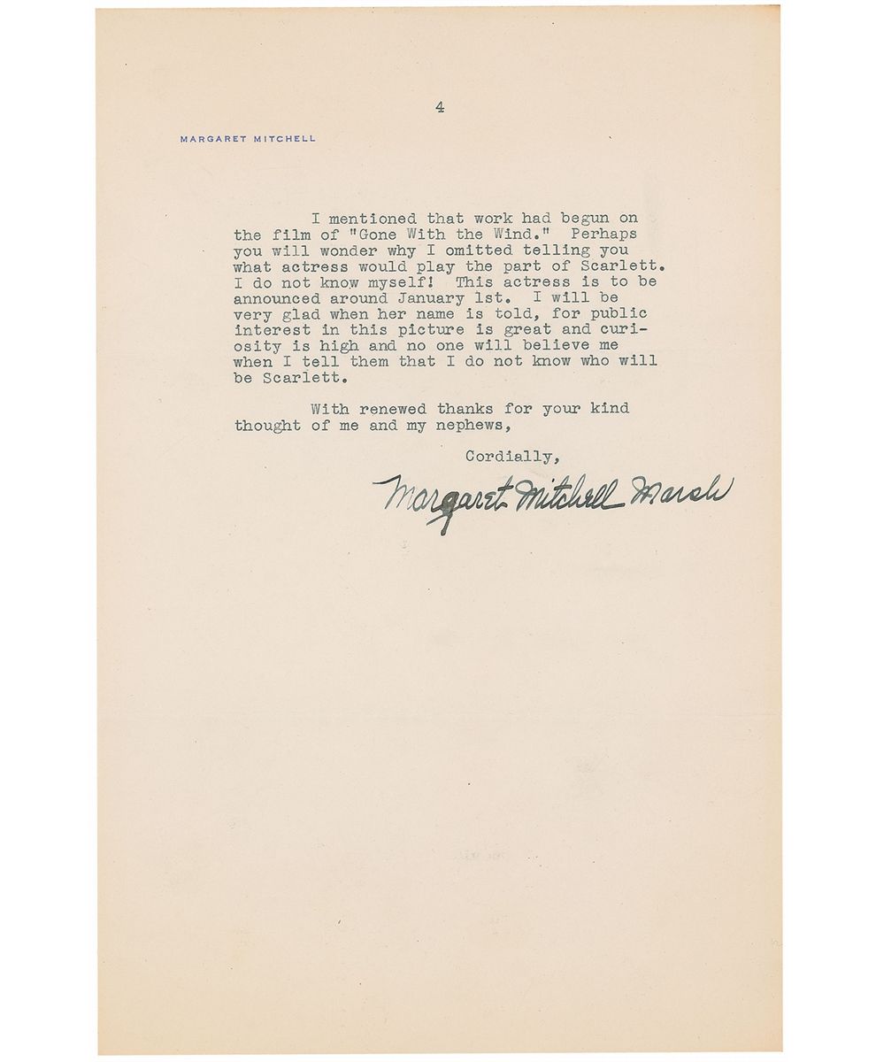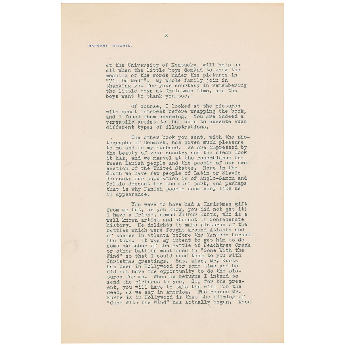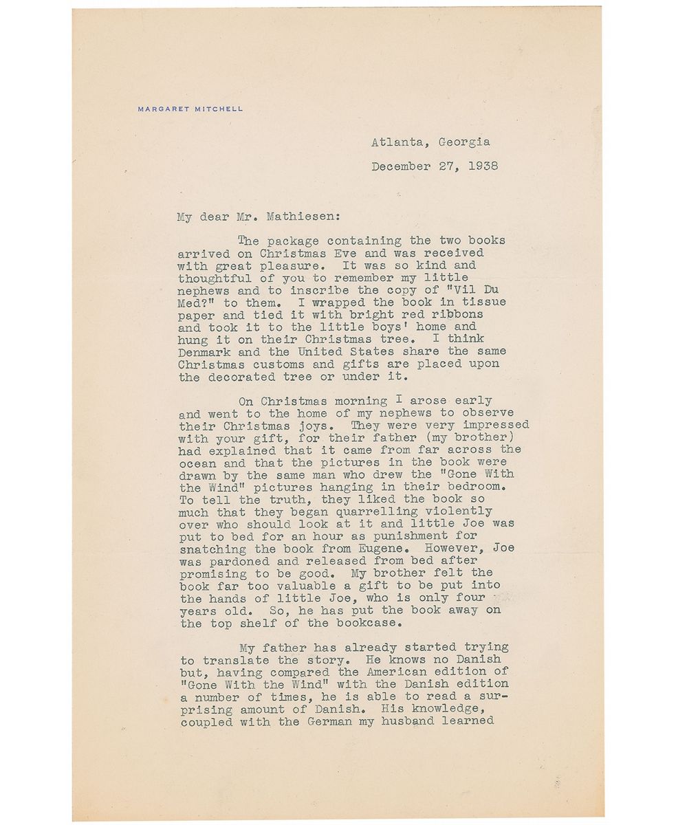 TLS signed “Margaret Mitchell Marsh,” four pages, 7 x 11, personal letterhead, December 27, 1938. Wonderful letter to Danish illustrator Axel Mathiesen. In part: "I think Denmark and the United States share the same Christmas customs and gifts are placed upon the Christmas tree or under it. On Christmas morning I arose early and went to the home of my nephews…They were very impressed with your gift, for their father (my brother) had explained that it came from far across the ocean and that the pictures in the book were drawn by the same man who drew the 'Gone With the Wind' pictures hanging in their bedroom…