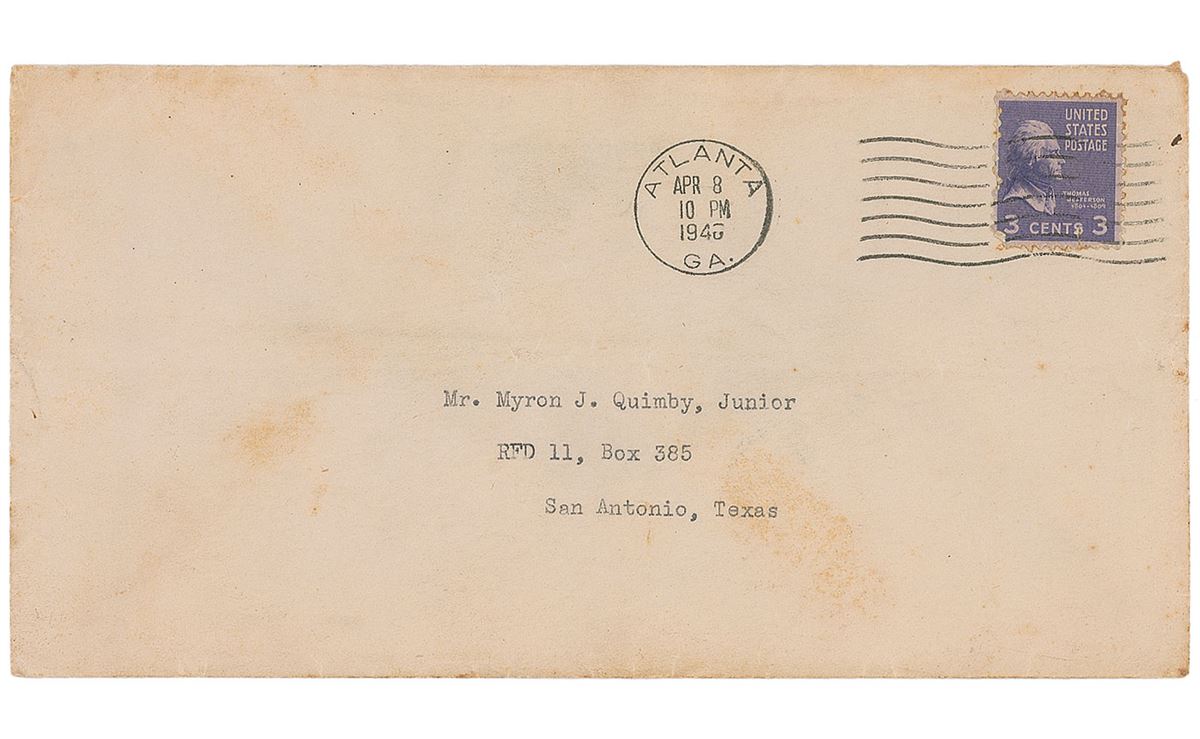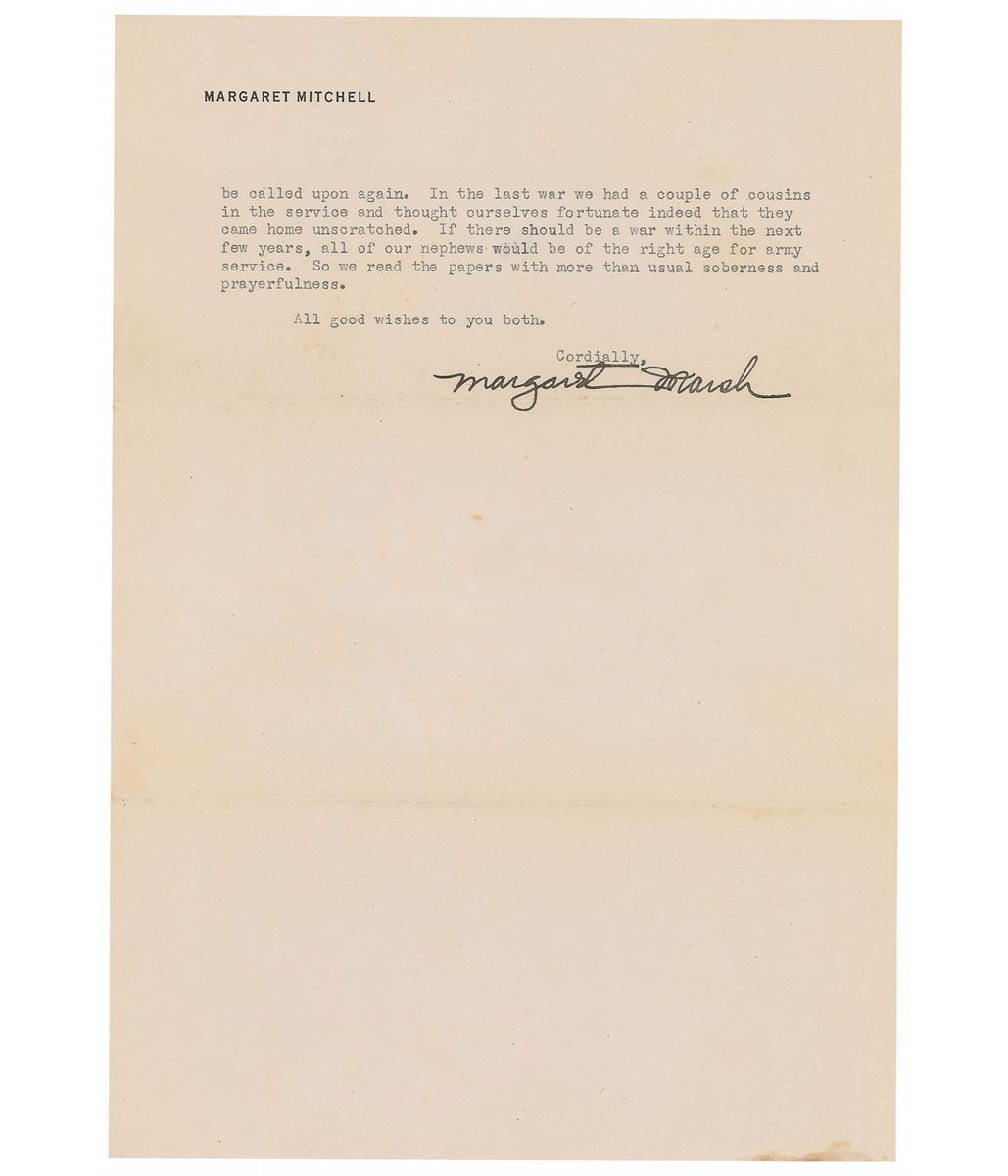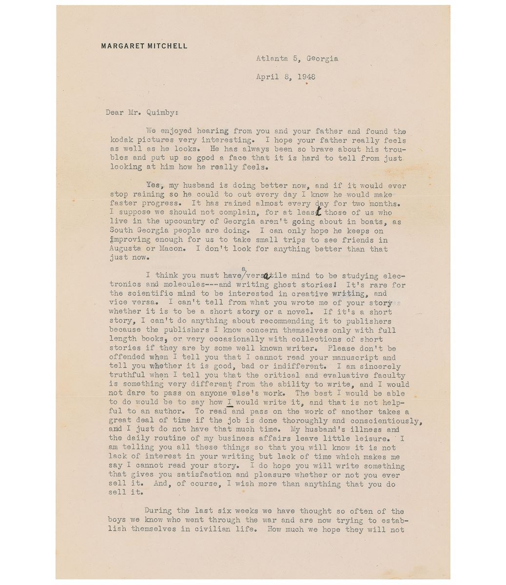 TLS signed “Margaret Marsh,” two pages, 7.25 x 10.5, personal letterhead, April 8, 1948. Letter to Myron Quimby, an aspiring writer. In part: “I think you must have a versatile mind to be studying electronics and molecules—and writing ghost stories! It’s rare for the scientific mind to be interested in creative writing, and vice versa…I cannot read your manuscript and tell you whether it is good, bad or indifferent…the critical and evaluative faculty is something very different from the ability to write…The best I would be able to do would be to say how I would write it, and that is not helpful to an author…During the last six weeks we have thought so often of the boys we know who went through the war and are now trying to establish themselves in civilian life. How much we hope they will not be called upon again. In the last war we had a couple of cousins in the service and thought ourselves fortunate indeed that they came home unscratched. If there should be a war within the next few years, all of our nephews would be of the right age for army service. So we read the papers with more than usual soberness and prayerfulness.” Mitchell makes a few handwritten corrections throughout the text. In fine condition, with trivial foxing to a couple areas. Accompanied by the original mailing envelope. Mitchell’s reflection on World War II was probably spurred by the increasing unrest in Korea, where thousands upon thousands of protesters had been killed in the Jeju Uprising on April 3. During World War II, Mitchell volunteered for the American Red Cross and devoted much of her time to writing encouraging letters to men in uniform overseas. A letter with a great historical association and exceptional content on the craft of writing.