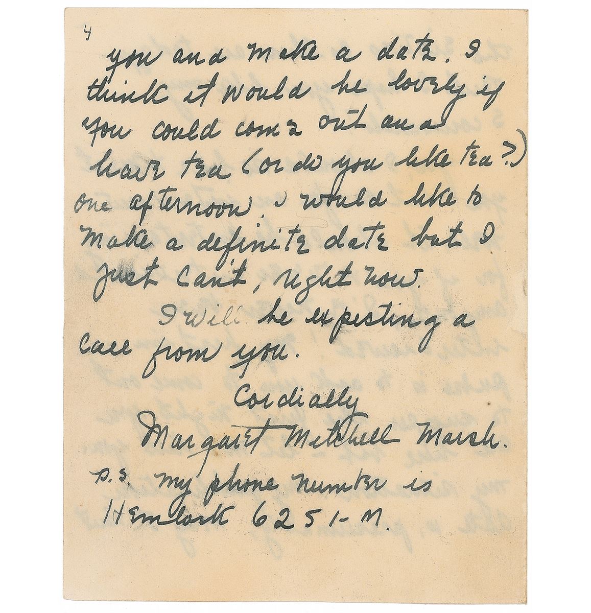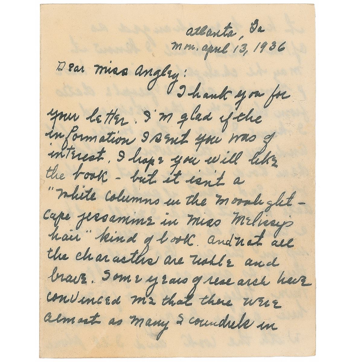 ALS signed “Margaret Mitchell Marsh,” four pages on two adjoining sheets, 4 x 5, April 13, 1936. Letter to Miss Martha Angley. In part: “I'm glad if the information I sent you was of interest. I hope you will like the book—but it isn't a 'White Columns in the Moonlight—Cape jessamine in Miss Melissy's hair' kind of book. And not all the characters are noble and brave. Some years of research have convinced me that there were almost as many Scoundrels in the Sixties as there are today. But I hope you like my Scoundrels!