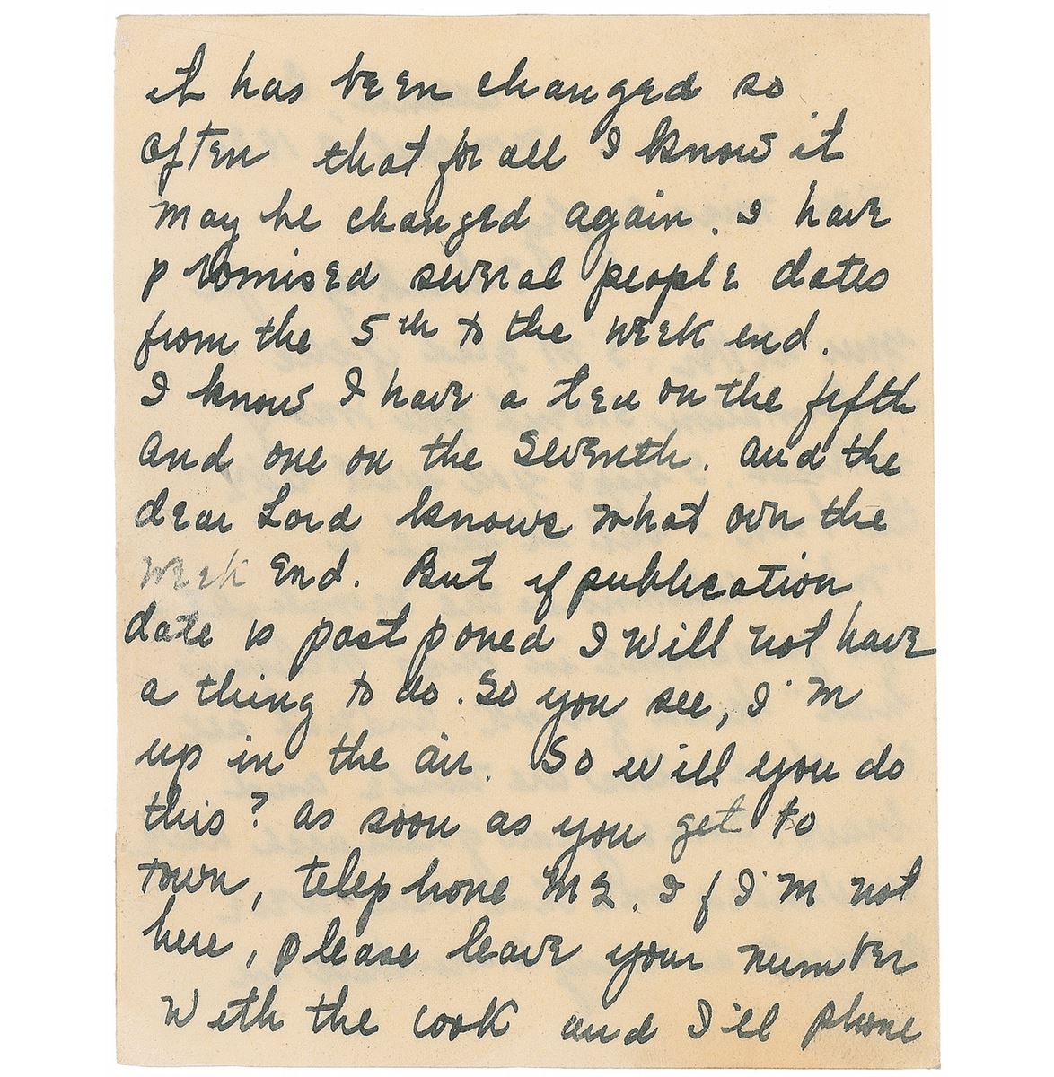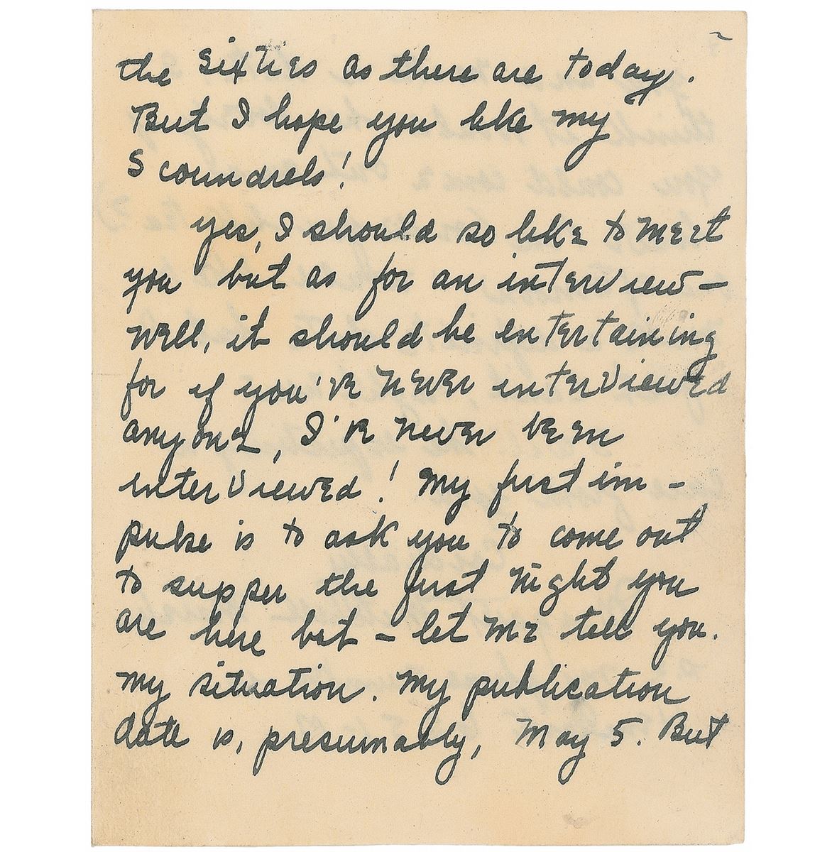 Yes, I should so like to meet you but as for an interview—well it should be entertaining for if you've never interviewed anyone, I've never been interviewed! My first impulse is to ask you to come out to supper the first night you are here but—let me tell you my situation. My publication date is, presumably, May 5. But it has been changed so often that for all I know it may be changed again. I have promised several people dates from the 5th to the week end. I know I have a tea on the fifth and one on the seventh. And the dear Lord knows what over the week end. But if publication date is postponed I will not have a thing to do. So you see, I'm up in the air. So will you do this? As soon as you get to town, telephone me. If I'm not here, please leave your number…I would like to make a definite date but I just can't, right now.” In fine condition, with light soiling and some brushing to ink. Accompanied by the original mailing envelope (now laminated) addressed in Mitchell’s hand, incorporating her initials, “M. M. M.,” in the return address on the flap.