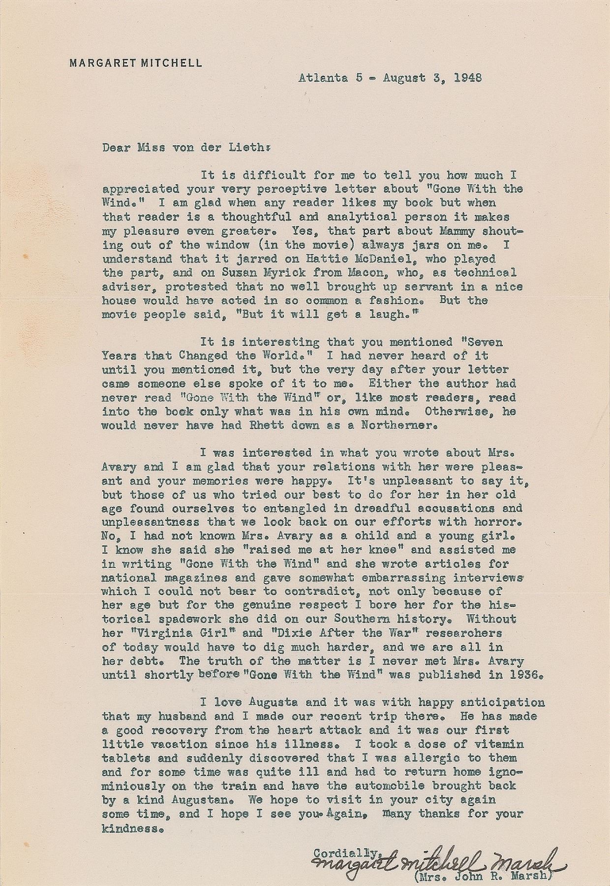 TLS signed “Margaret Mitchell Marsh,” one page, 7.25 x 10.5, personal letterhead, August 3, 1948. Letter to Lucile von der Lieth, in full: "It is difficult for me to tell you how much I appreciated your very perceptive letter about 'Gone With the Wind.' I am glad when any reader likes my book but when that reader is a thoughtful and analytical person it makes my pleasure even greater. Yes, that part about Mammy shouting out of the window (in the movie) always jars on me. I understand that it jarred on Hattie McDaniel, who played the part, and on Susan Myrick from Macon, who, as technical adviser, protested that no well brought up servant in a nice house would have acted in so common a fashion. But the movie people said, 'But it will get a laugh.'