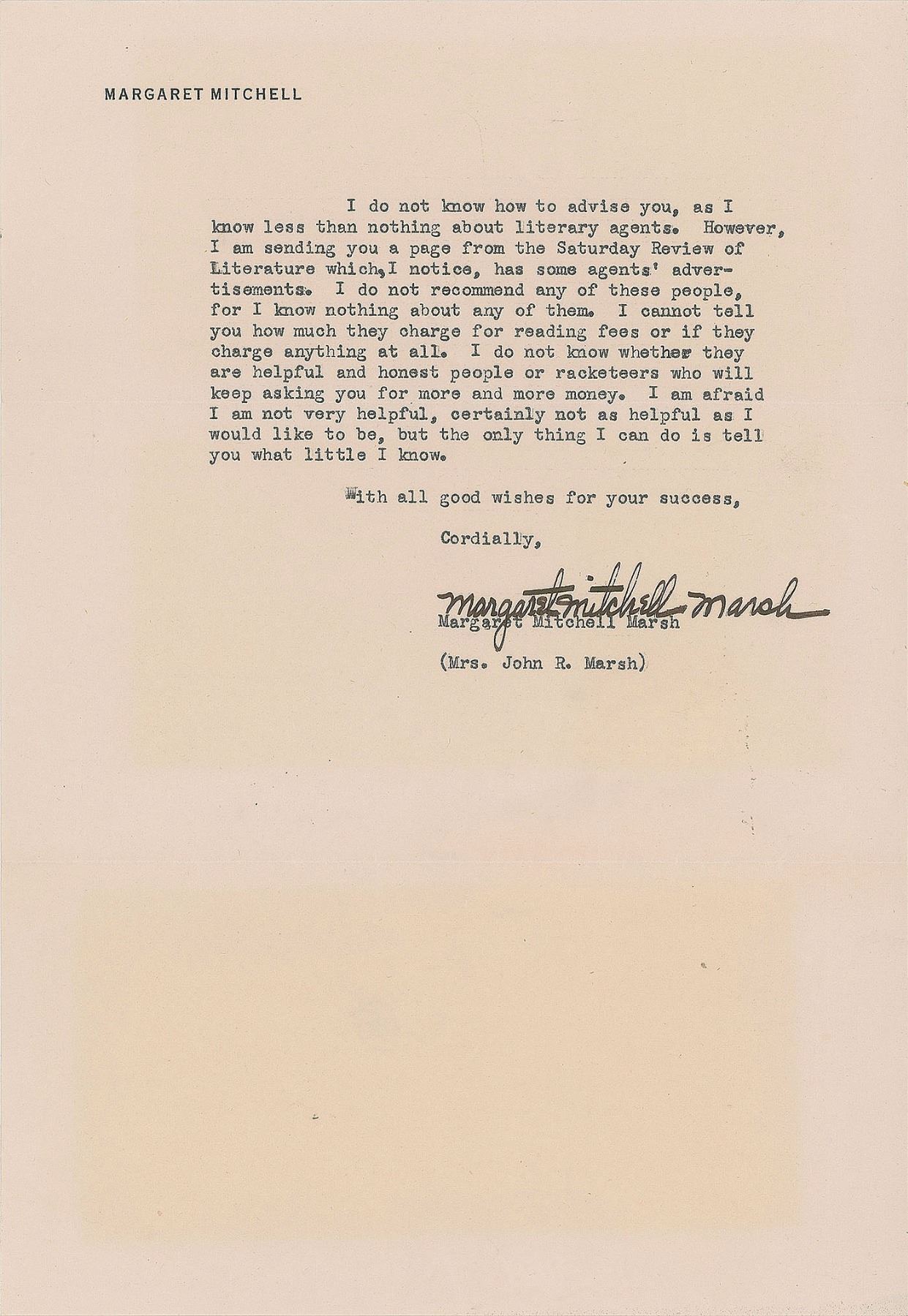 TLS signed “Margaret Mitchell Marsh,” two pages, 7.25 x 10.5, personal letterhead, July 23, 1947. Letter to Mrs. George W. Johnson of the Johnson Printing Company, in full: “Thank you so much for writing me that you had derived pleasure from ‘Gone With the Wind.’ I appreciated what you said. I am glad to answer your inquiries about how the sale of ‘Gone With the Wind’ was made to the movies. I do not believe, however, that it will be of much assistance to you in your problem, as I have never met any writer who handled things the way I did. The Macmillan Company published my novel and, as I was receiving a number of offers for the screen rights, I asked The Macmillan Company to act as my agent and manage the sale of the motion picture rights for me. The Macmillan Company sold ‘Gone With the Wind’ to Mr. David Selznick, who produced the film from it. So, you see, as your material has not yet been published, you could not proceed in the same fashion I did.