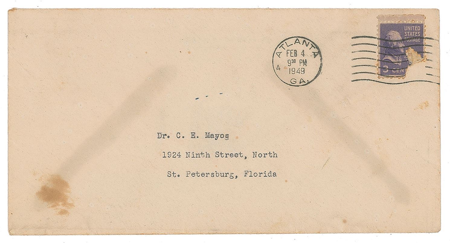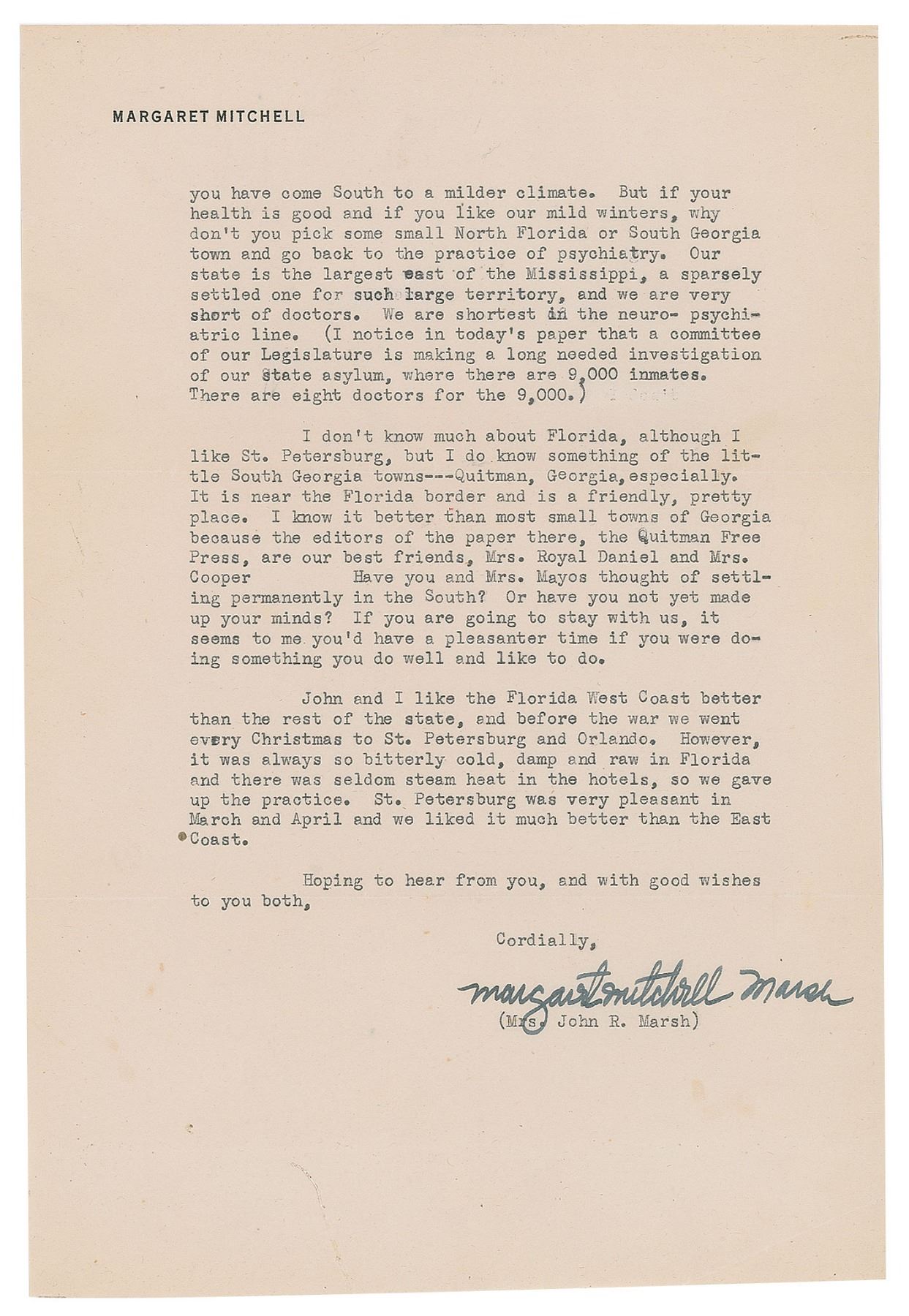 TLS signed “Margaret Mitchell Marsh,” two pages, 7 x 10.25, personal letterhead, February 4, 1949. Interesting letter to "Doctor Mayos," in part: "John and I were very disappointed when we learned that you had been through Atlanta and we had not known of your presence here. We were sorry, too, that you were routed through our poorer section and missed seeing the residences which are Atlanta's chief charm…If John's strength continues to improve, we hope to go to the annual Georgia editors' meeting at Athens…John's health does improve. While his activities are limited at present, we have no complaint to make because this time last year he could barely crawl about the house. Now, thanks to a good doctor and a fine philosophy of life, John is making excellent progress…You may think that seventy is old, but we do not, and we feel that a man of your age and knowledge has much of value to give and that it is a sheet waste if you are not giving it. Perhaps you are not in good health—that we do not know—and perhaps that is why you have come South to a milder climate. But if your health is good and if you like our mild winters, why don't you pick some small North Florida or South Georgia town and go back to the practice of psychiatry. Our state is the largest east of the Mississippi, a sparsely settled one for such a large territory, and we are very short of doctors. We are shortest in the neuro-psychiatric line." In fine condition, with a few light creases and a rusty paperclip impression to the top of the first page.