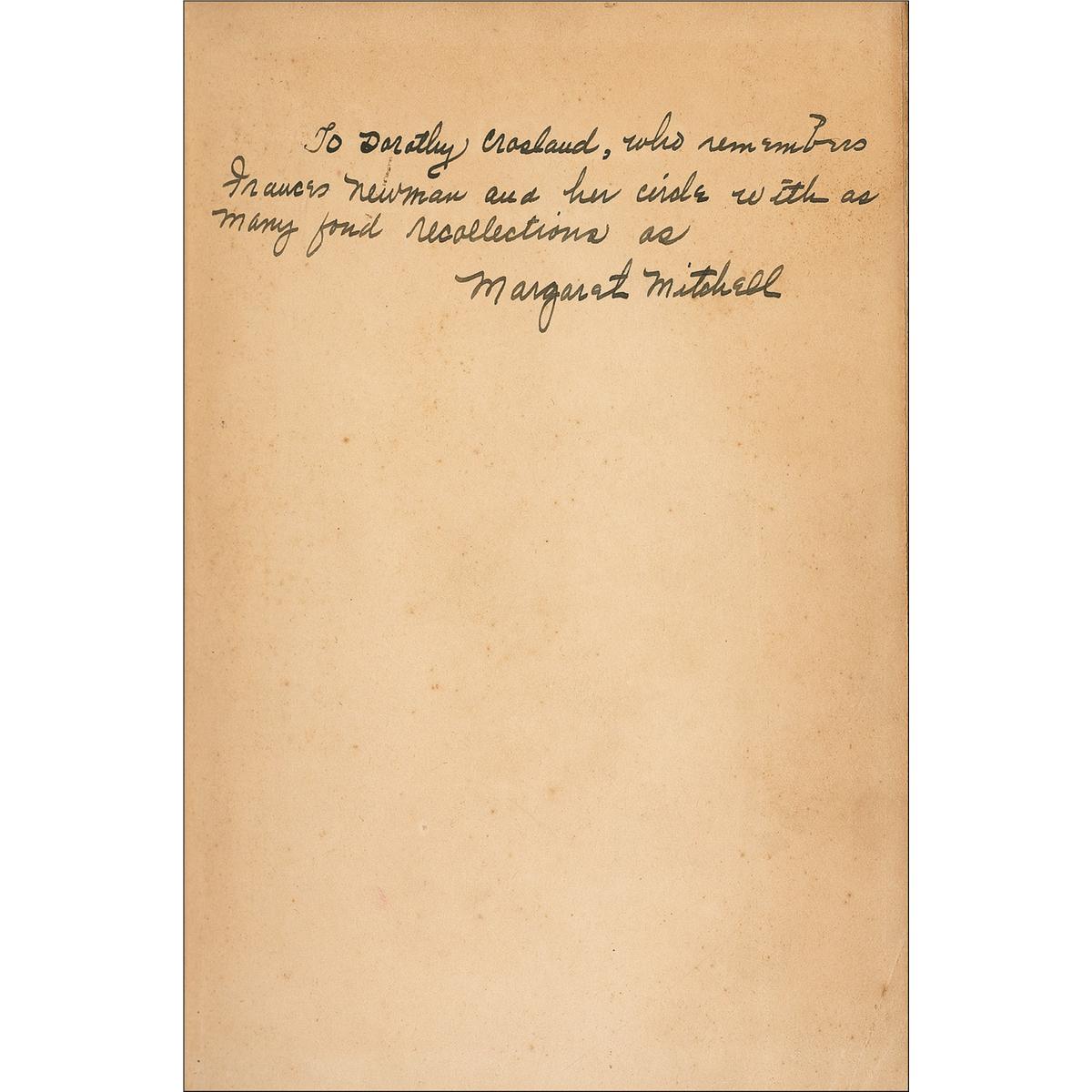 Signed book: Gone With the Wind. First edition, later printing. NY: Macmillan Company, 1936. Hardcover with dustjacket, 6 x 9, 1037 pages. Signed and inscribed on the first free end page, “To Dorothy Crosland, who remembers Frances Newman and her circle with as many fond recollections as Margaret Mitchell.” In very good condition, with toning and foxing to the signed page, with light foxing to following pages and mild toning to inside pages, ownership signature (”Evelyn Henley Crosland, October 1, 1936”) to inside front cover, scattered wear to the boards, and soiling and two heavy vertical creases to the spine. The dust jacket (not original, but from a later printing) exhibits overall handling wear, creases and small tears, and areas of chipping and paper loss (including a chip to the Confederate flag on the spine). Both Crosland and Newman were librarians who assisted Mitchell in the historical research of the book. Due to overwhelming demands upon her, Mitchell signed copies of Gone With the Wind only for a short time after publication, even denying friends and relatives; inscribed copies are thus quite uncommon.