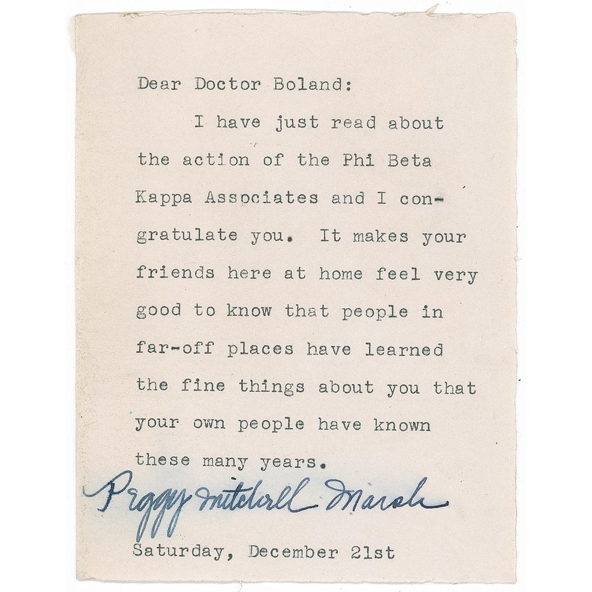 TLS signed “Peggy Mitchell Marsh,” one page, 3.75 x 5, December 21 [no year]. Mitchell writes to Dr. Boland, Chairman of the Atlanta chapter of the American Red Cross, where Mitchell was a volunteer during World War II. In full: “I have just read about the action of the Phi Beta Kappa Associates and I congratulate you. It makes your friends here at home feel very good to know that people in far-off places have learned the fine things about you that your own people have known for these many years.” In very good condition, with professional restoration to paper, trimmed edges, and subtle overall haloing to signature. The association of Margaret Mitchell with Dr. Frank Boland may have begun at the Atlanta Chapter of the Red Cross as they began preparations for World War II in 1939. One of the biggest supporters of the Atlanta Chapter during wartime was author Margaret Mitchell, known as “Peggy” by her many friends in the Red Cross and elsewhere.