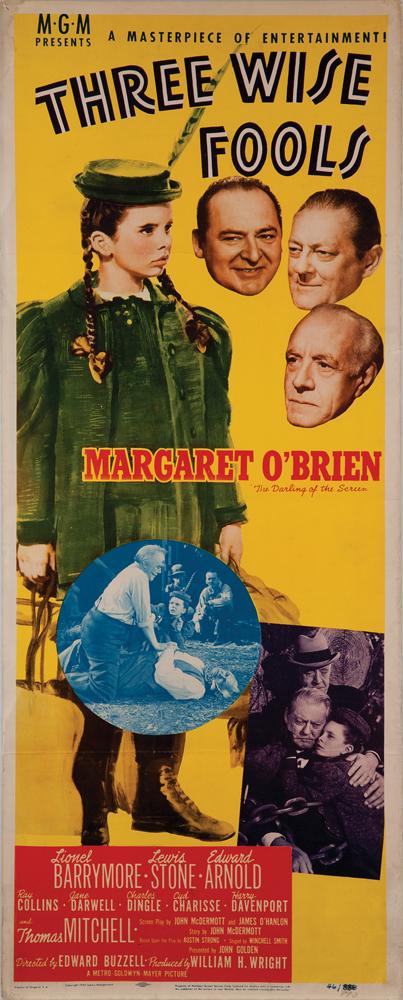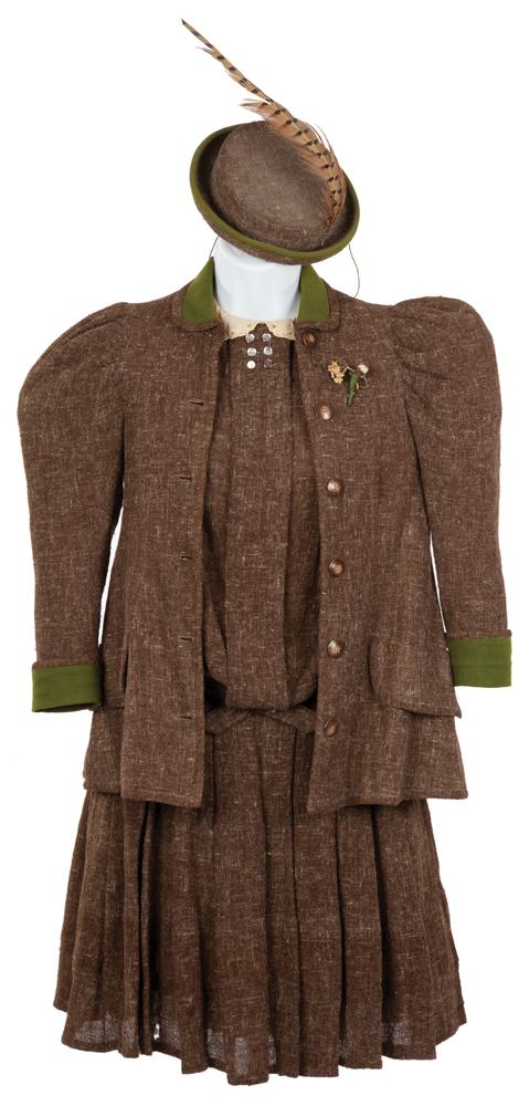 (MGM, 1946) Margaret O’Brien’s principal and signature wardrobe for this film consisted of this entire ensemble offered here together: a medium brown, rough-hewn wool dress with silk collar and undershirt accented by pearlescent buttons, and chintz and heavy taffeta slip and petticoat; matching coat with silk lining, dark green cuffs and collar, accented by sprig of artificial flowers; and very small matching pillbox hat with green brim, accented by pheasant feather. Each item has original label sewn-in reading “MARGARET O’BRIEN” and first two also list MGM’s production #1372. All of these items are clearly visible in the three images of O’Brien on the original 14 x 36” insert poster which accompanies the costume. Very fine.
