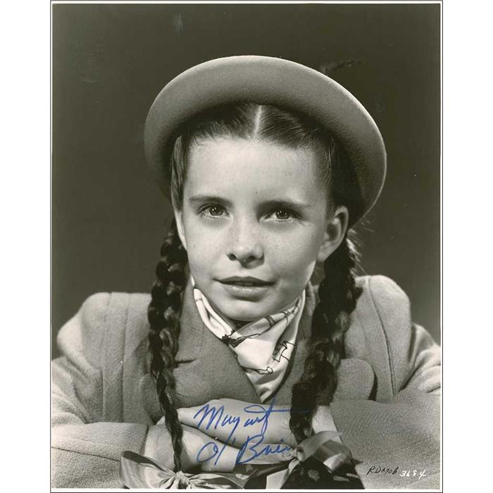 Glossy 7.75 x 9.5 photo of the young actress in a wool hat and coat, signed in blue felt tip. In fine condition, with lightly trimmed edges, and some scattered light surface marks. Pre-certified PSA/DNA and RRAuction COA.