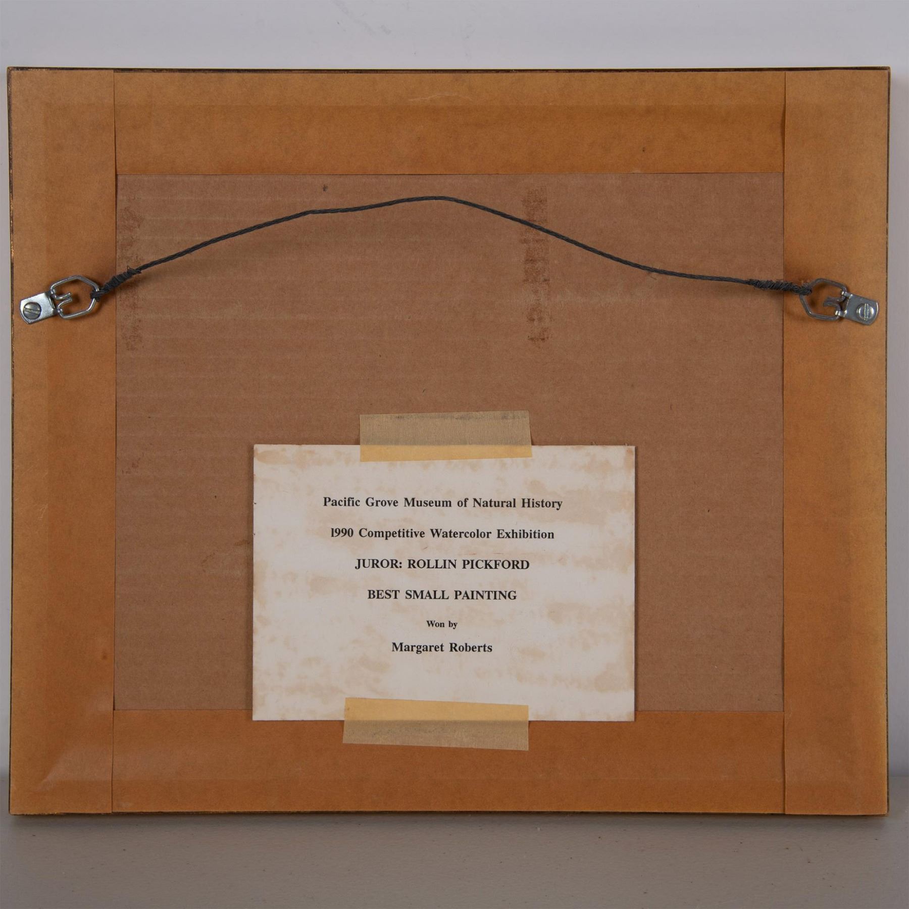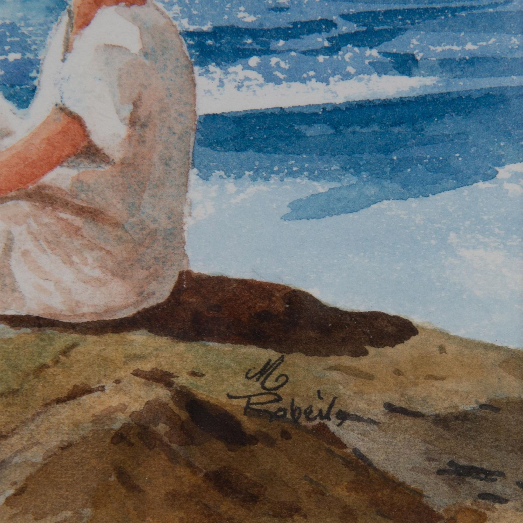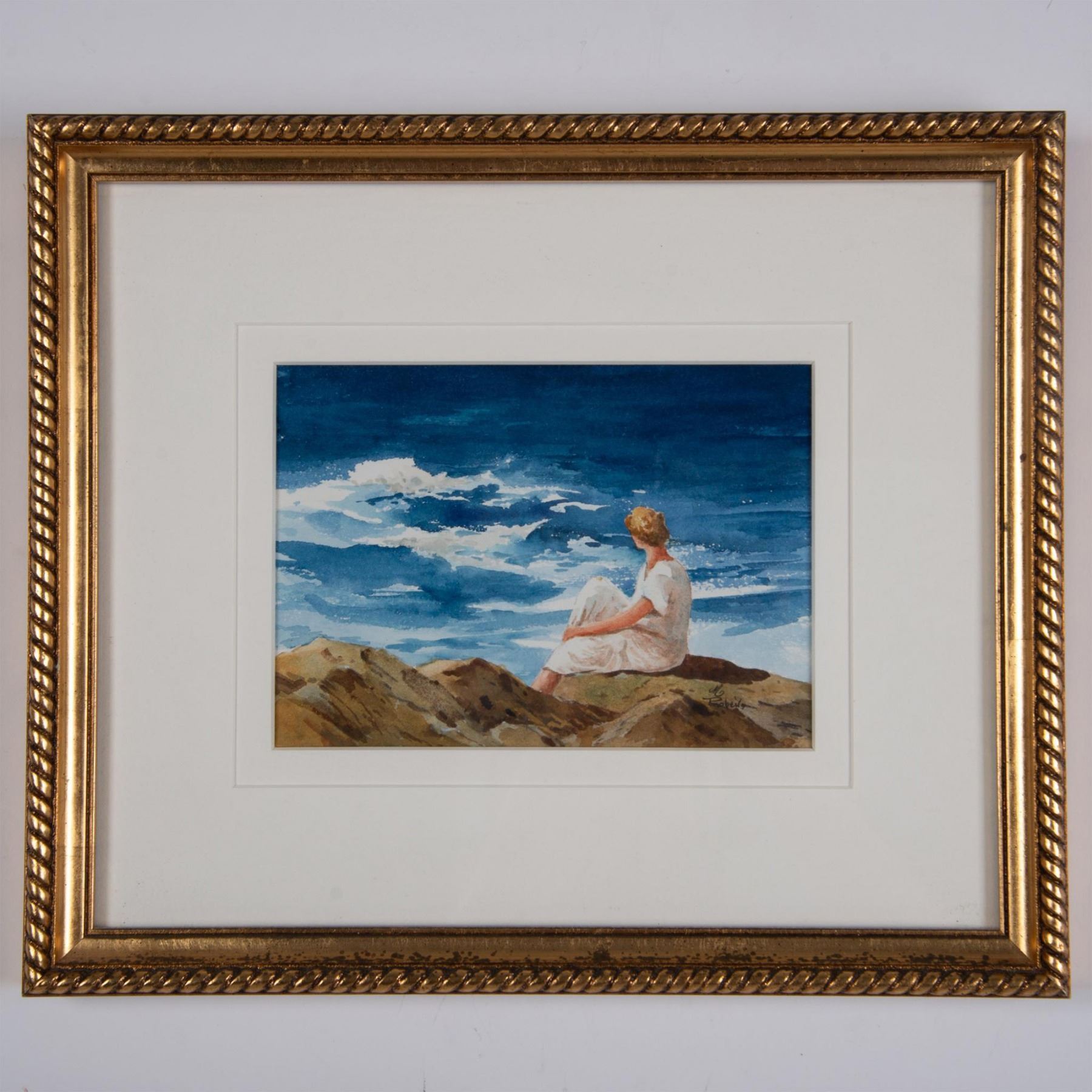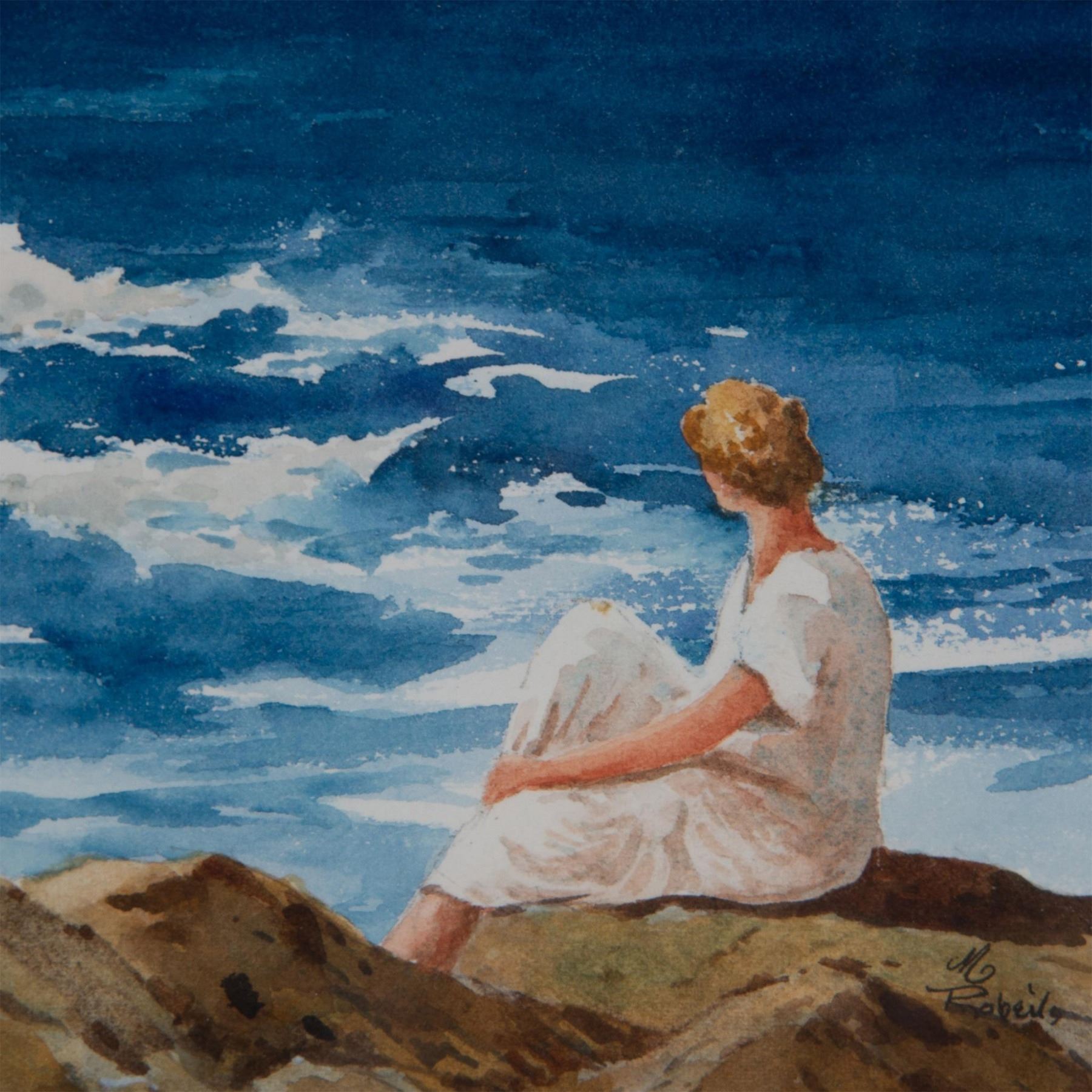 A stunning watercolor painting by artist Margaret Roberts, titled Meditation, capturing a tranquil scene of a woman seated on rocks, observing the nearby waves crashing. It won the Best Small Painting at the 1990 Competitive Watercolor Exhibition at the Pacific Grove Museum of Natural History. Artist signature on lower right side. Housed in a gilded frame with a rope pattern, with a white mat. Artwork dimensions: 7"L x 5.5"H. Frame dimensions: 13.25"L x 1"W x 11.25"H.