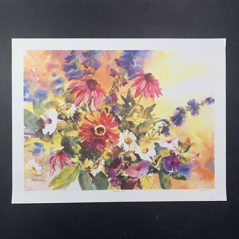 Margaret Roseman's "Summer Mix" Limited Edition Print. A colorful floral arrangement. This piece is signed in the lower right, numbered "AP" in the lower left and titled in the lower middle. There is a tiny tear on the right margin but does not affect the image and otherwise, it is in excellent condition.