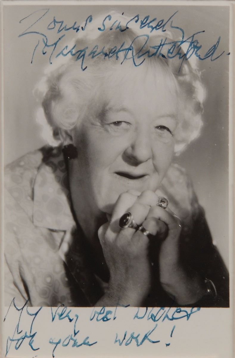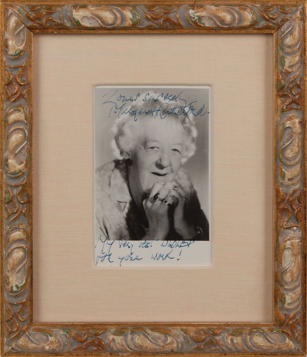 Character actress (1892–1972) who won the Oscar for Best Supporting Actress in 1963 for her role as the Duchess of Brighton in The VIPs. Vintage semi-glossy 3.25 x 5 photo of the acclaimed British actress, signed in fountain pen, “Yours sincerely, Margaret Rutherford, My very best wishes for your work!” Cloth-matted and framed to an overall size of 8.5 x 10. In fine condition.