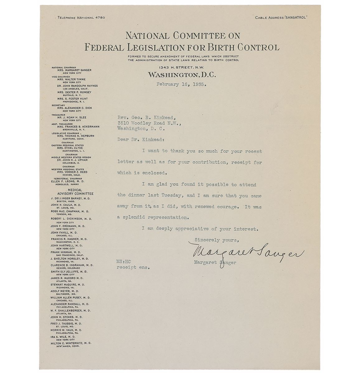 American sex educator, nurse, and birth control activist (1879–1966) who founded the American Birth Control League in 1921. TLS, one page, 8.5 x 11, National Committee on Federal Legislation for Birth Control letterhead, February 16, 1935. Letter to Dr. Kinkead, in part: “I am glad you found it possible to attend the dinner last Tuesday, and I am sure that you came away from it, as I did, with renewed courage. It was a splendid representation.” In fine condition, with an expected mailing fold passing through the top of two letters, and a paperclip impression to top edge.