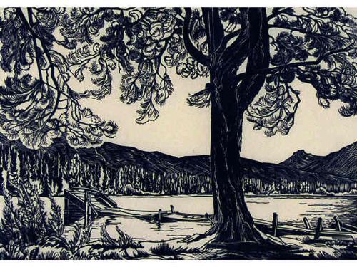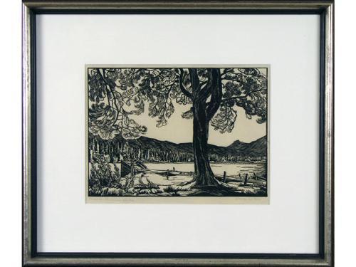 [Canadian, ASA, CPE, CSGA, 1915-1984] PINE ON LUCERNE LAKE; 1947 Linocut on paper; Ed. #31/50 7 1/4 x 10 ins. -Signed, titled, dated & editioned