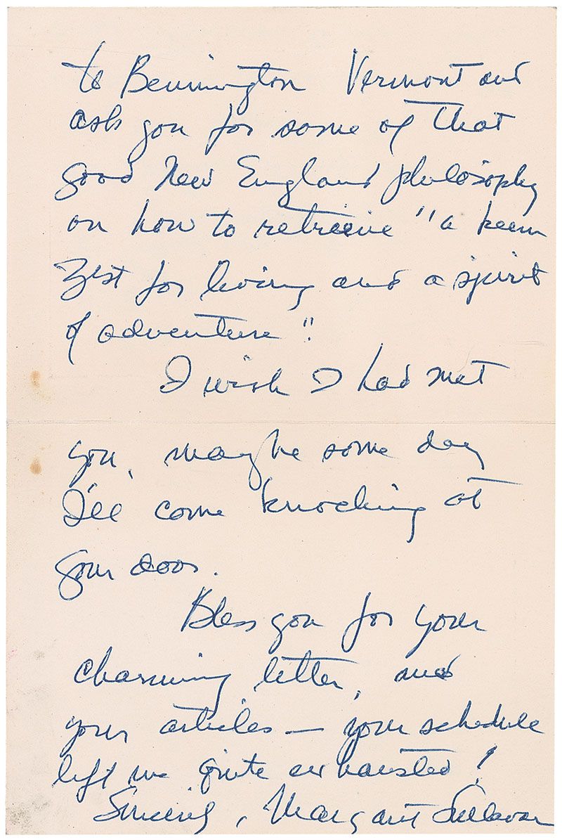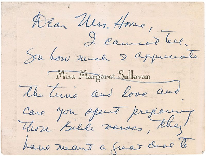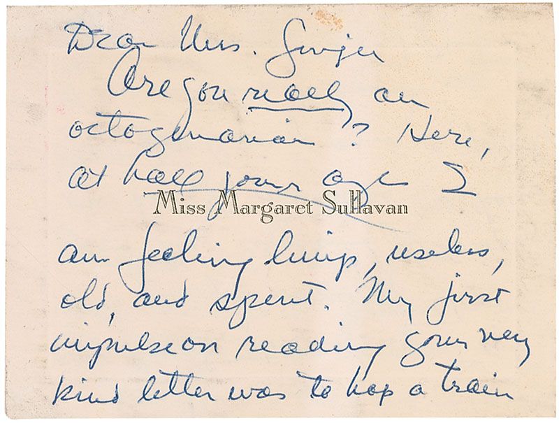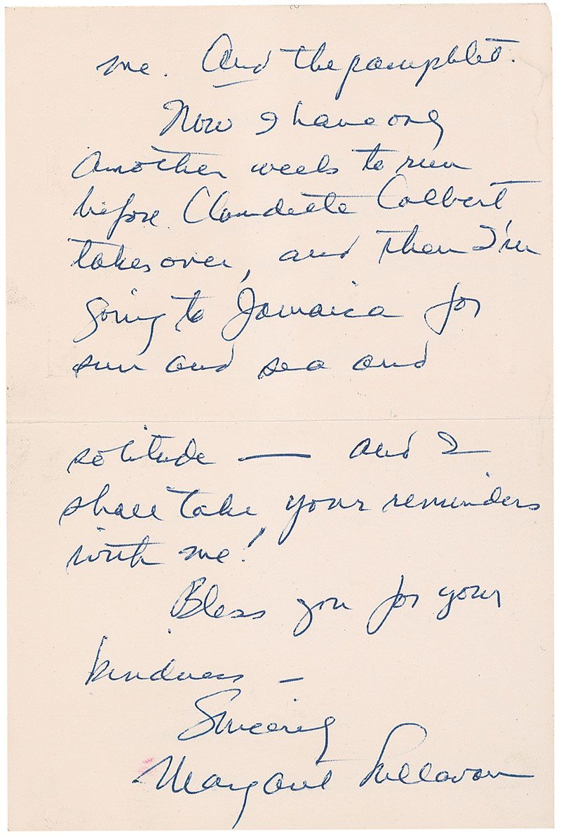 Two ALSs, both one page, both sides, on her personal 4 x 3 notecards, no dates. One letter reads, in part: “Now I have only another week to run before Claudette Colbert takes over, and I’m going to Jamaica for sun and sea and solitude.” Both letters are affixed to slightly larger off-white sheets by their backs. Some scattered light toning and soiling, otherwise fine condition.