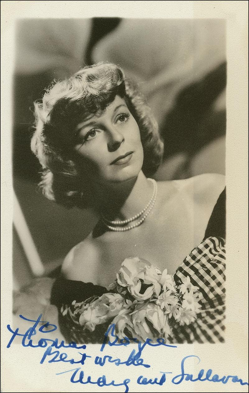 Vintage matte-finish 3.5 x 5.5 photo of the husky-voiced charmer, signed and inscribed in blue fountain pen “To Thomas Boyce, Best wishes, Margaret Sullavan.” In fine condition, with slight rippling and a paperclip impression along the left side, touching her hair. Accompanying is the original mailing envelope addressed by Sullavan. Pre-certified PSA/DNA and RRAuction COA.