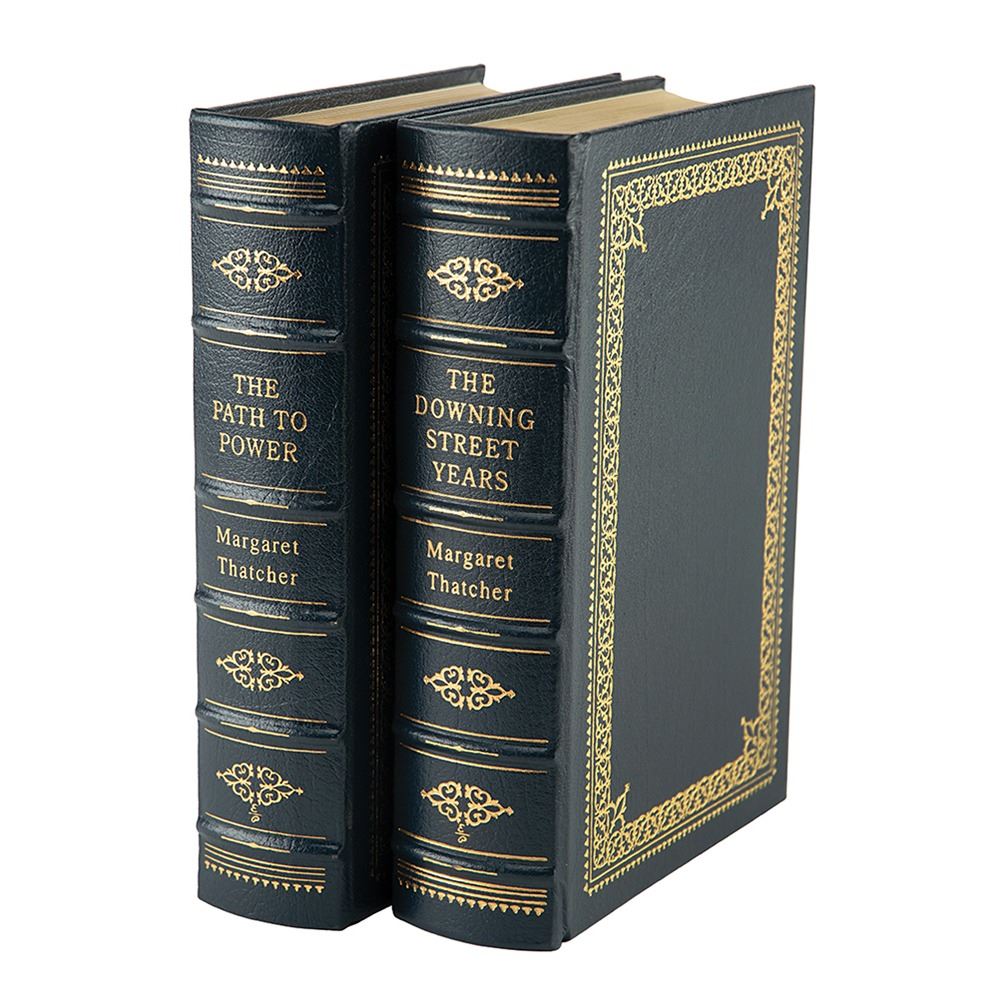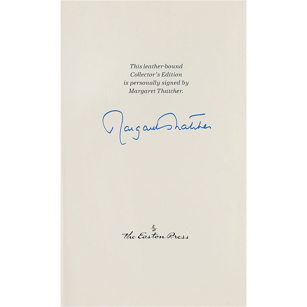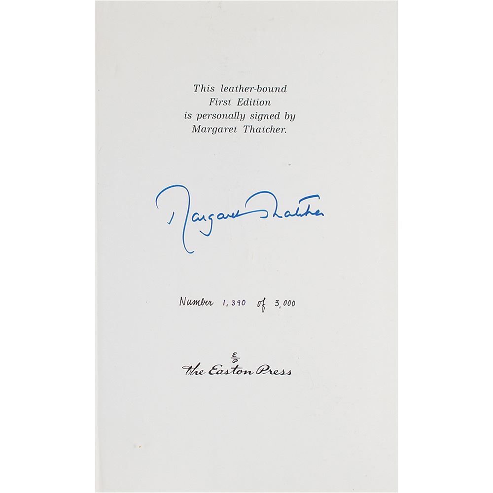 Attractive pair of limited edition leather-bound books published by Easton Press of Norwalk, Connecticut, both of which are signed on the colophon in blue felt tip by Margaret Thatcher—The Downing Street Years (collector’s edition) and The Path to Power (first edition, numbered 1390/3000). In overall very fine condition.