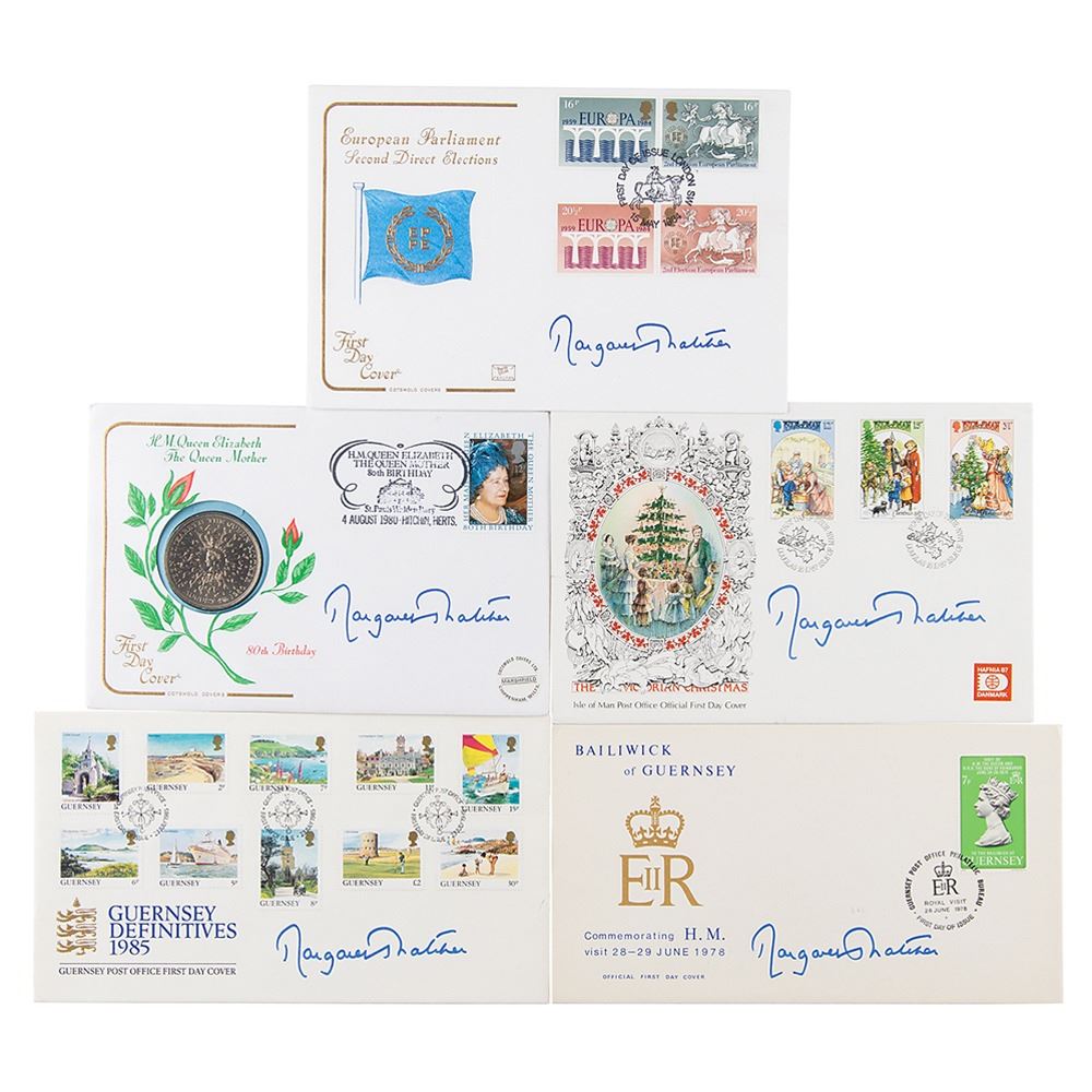 Group of five commemorative covers honoring various occasions, each signed in blue felt tip by Margaret Thatcher. Includes: one with an inset medallion honoring the 80th birthday of The Queen Mother; one for Christmas on the Isle of Man; one commemorating Queen Elizabeth II's visit to Guernsey; one honoring the second direct elections of the European Parliament; and one honoring the Guernsey Definitives of 1985. In overall fine to very fine condition.