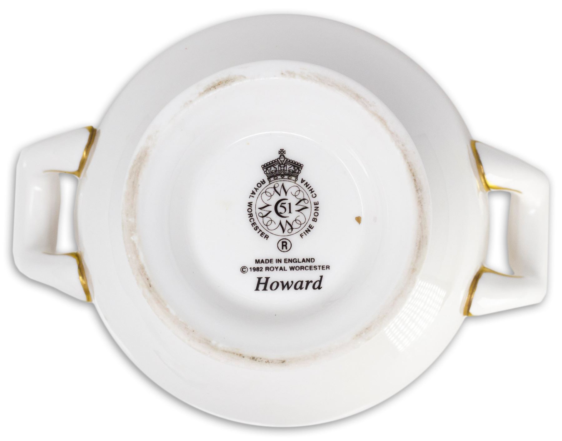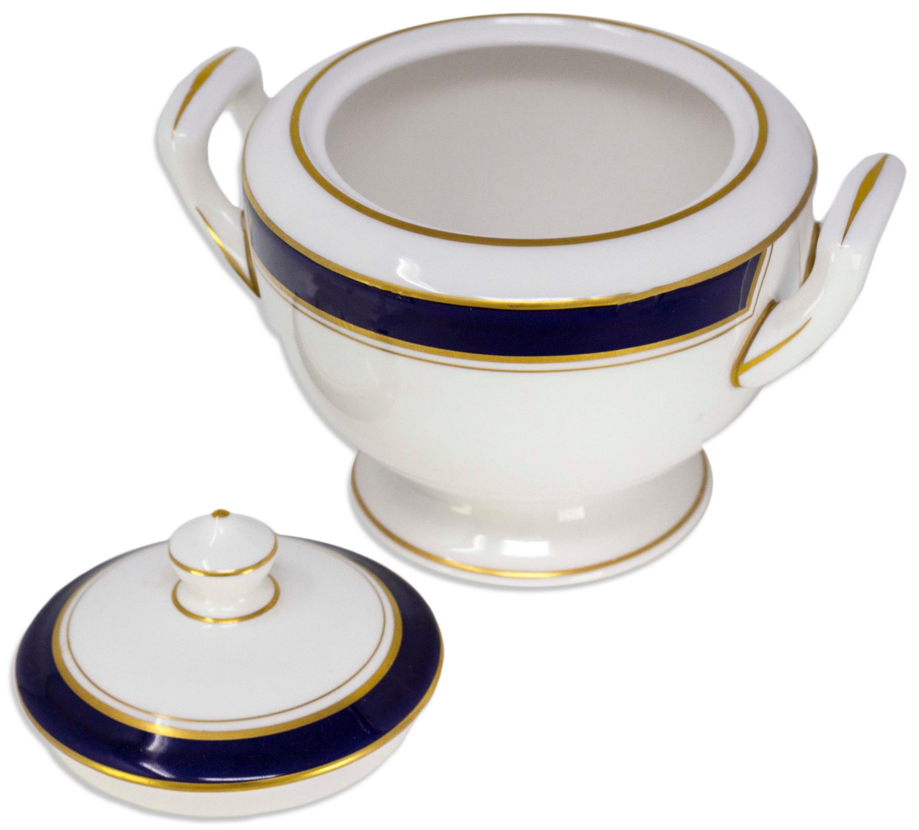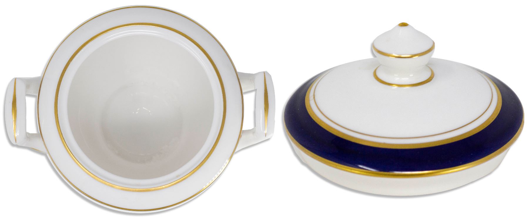 Margaret Thatcher personally owned porcelain china, a two-handed sugar bowl encircled in navy and gold. Handsome pattern by Royal Worcester is from 1982, likely used by Thatcher during her time as Prime Minister. With printed factory marks on underside. Measures 5.5'' across x 4.5'' high. Mild rubbing from use, overall near fine. A nice keepsake from the iconic Prime Minister.