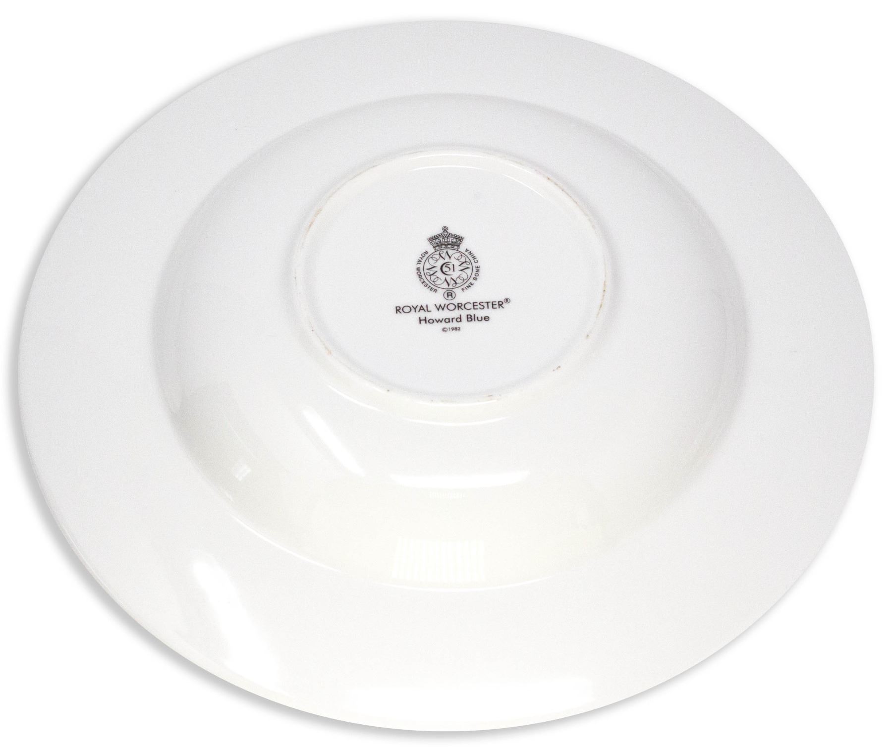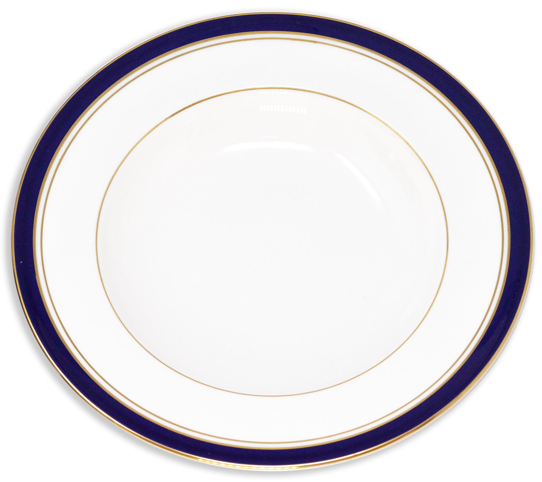 Margaret Thatcher personally owned porcelain china, a soup bowl encircled in navy and gold. Handsome pattern by Royal Worcester is from 1982, likely used by Thatcher during her time as Prime Minister. With printed factory marks on underside. Measures 9.25'' in diameter. Mild rubbing, else near fine condition.