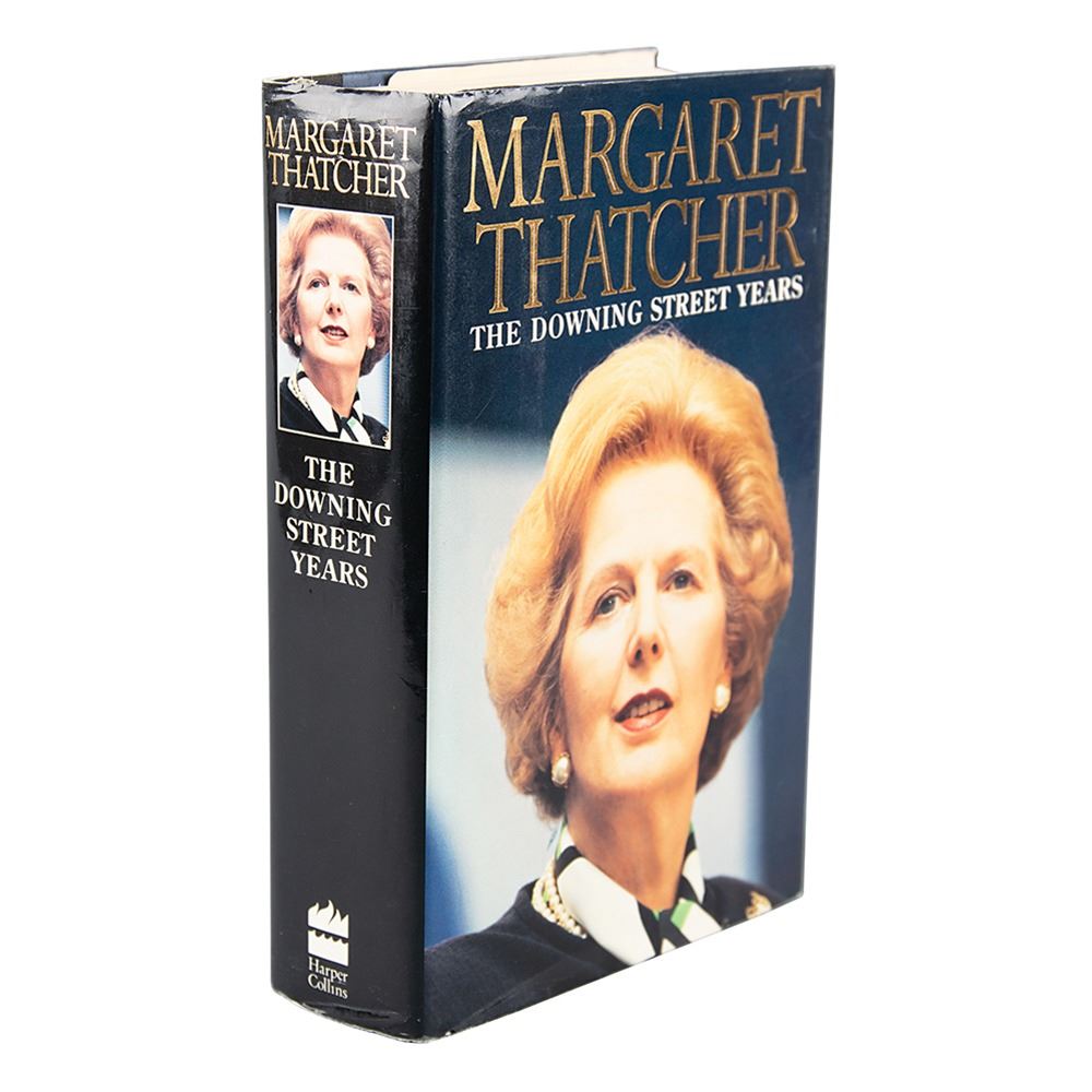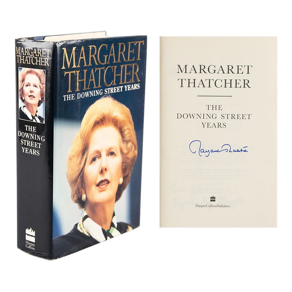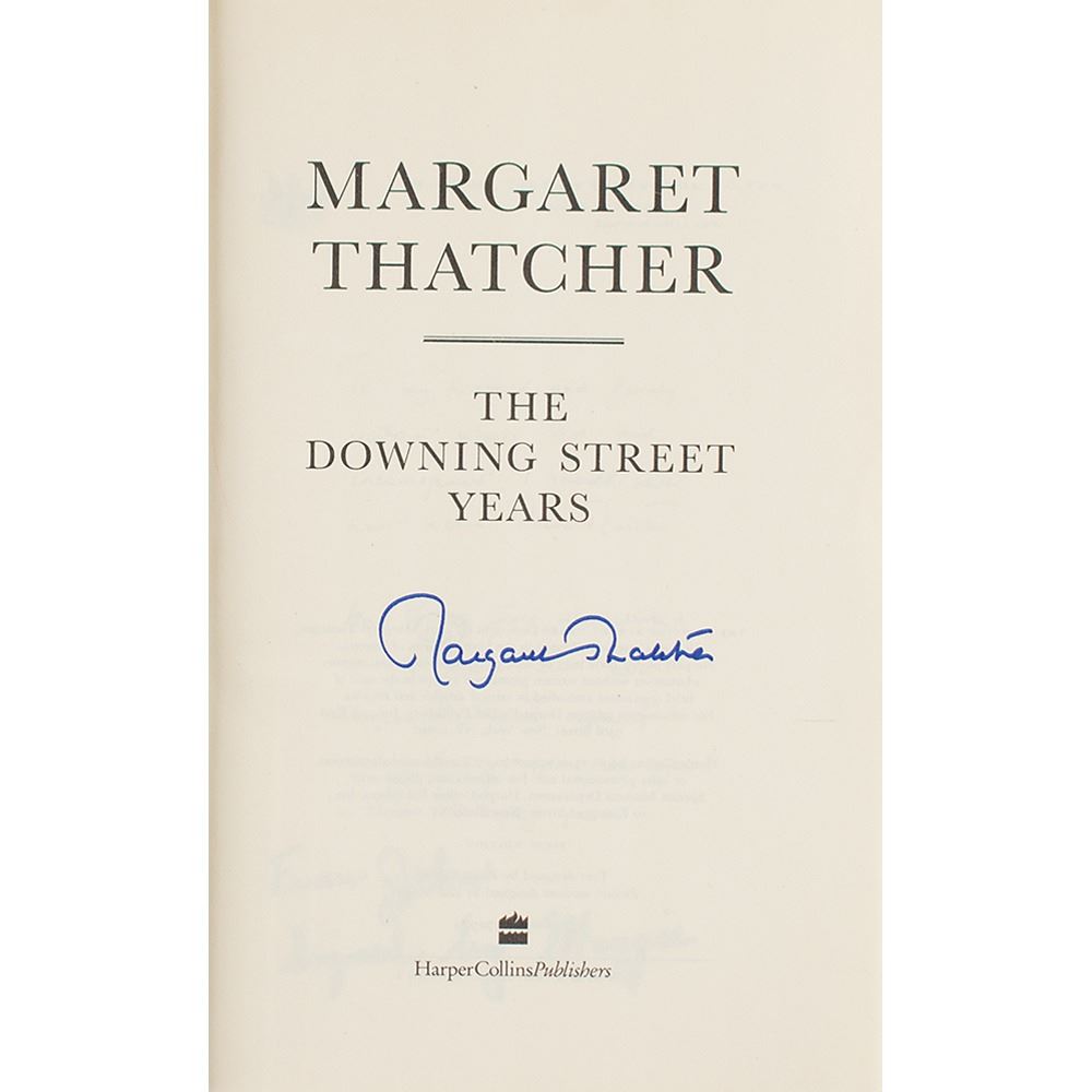Signed book: The Downing Street Years. First edition. NY: HarperCollins, 1993. Hardcover with dust jacket, 6.5 x 9.5, 914 pages. Signed on the title page in blue felt tip by Margaret Thatcher. In fine condition, with an ownership inscription on the dedication page, and the publication year circled on the copyright page.