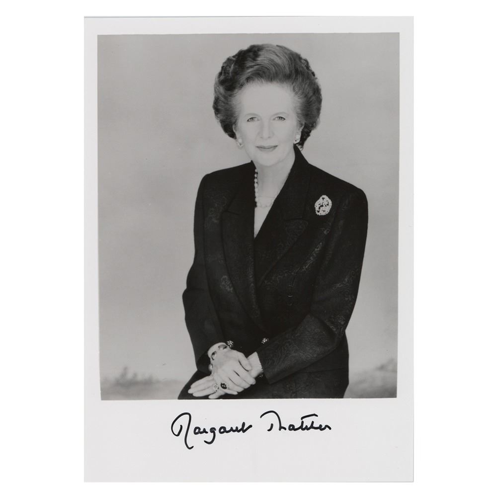 Satin-finish 5 x 7 half-length photo of Margaret Thatcher, signed in the lower border in black felt tip. In very fine condition.