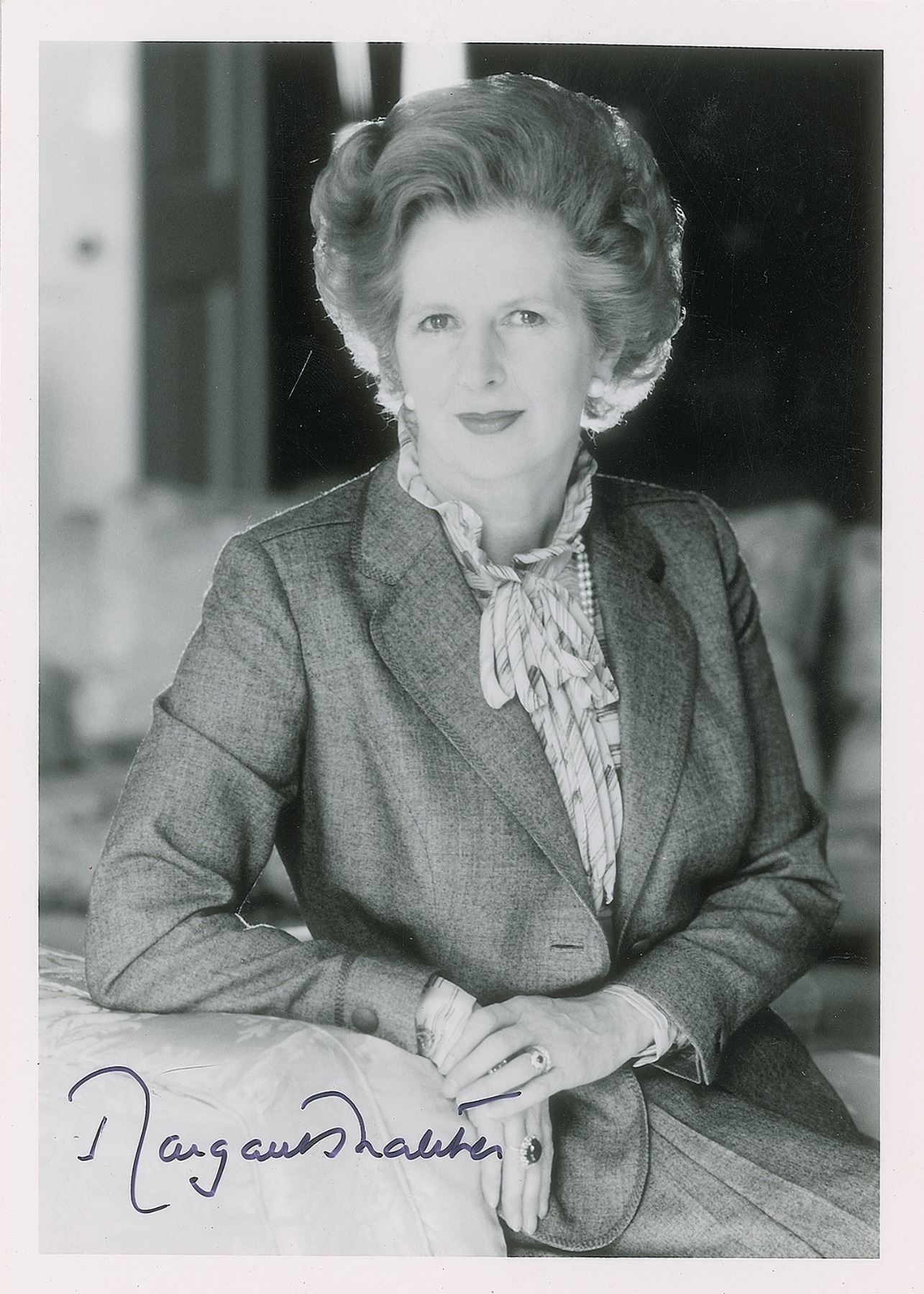 Glossy 5 x 7 half-length photo of Margaret Thatcher, signed in black felt tip. In fine condition, with a very slight bend to the upper right corner.