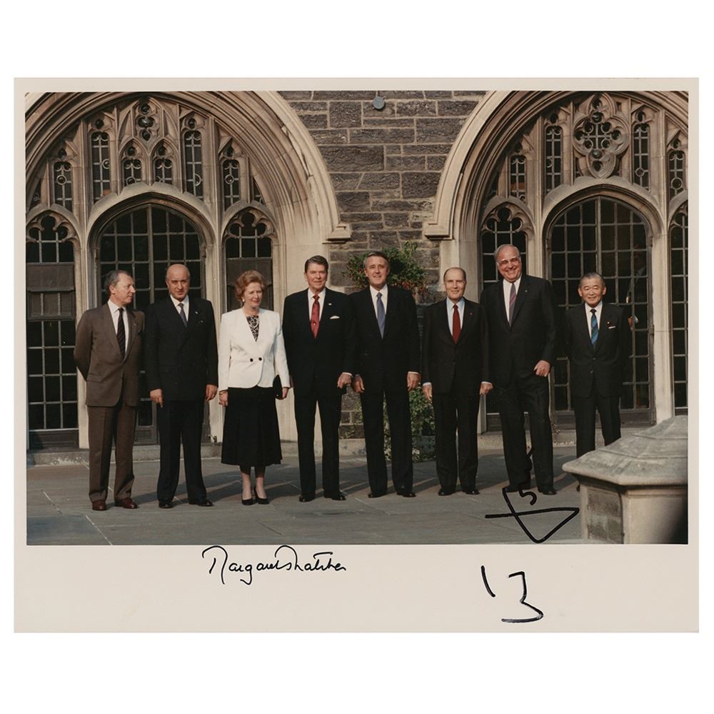 Color satin-finish 10 x 8 photo of the G-7 Economic Summit leaders at the University of Toronto in 1988, signed in black felt tip by Margaret Thatcher and Helmut Kohl. Reverse bears an "Official Photograph / The White House" stamp. In fine condition, with an area of light creasing to the right edge. Accompanied by a transmittal slip from Thatcher's assistant.