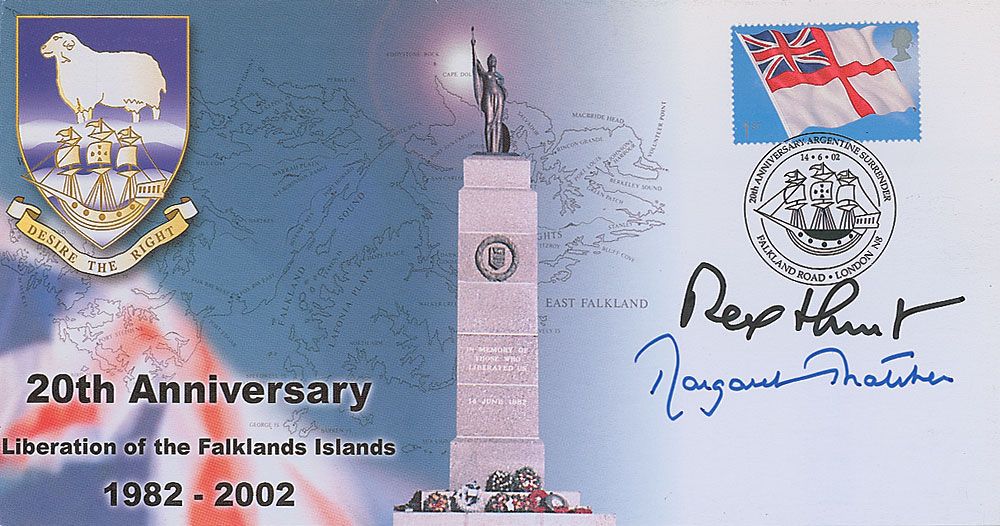 Commemorative cover, 8.5 x 4.5, with a cachet honoring the 20th anniversary of the liberation of the Falkland Islands, signed in blue felt tip by Margaret Thatcher and in black felt tip by Rex Hunt, the governor, commander-in-chief, and vice admiral of the Falkland Islands. In very fine condition.
