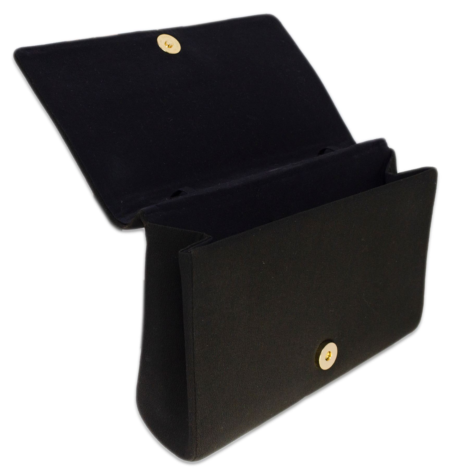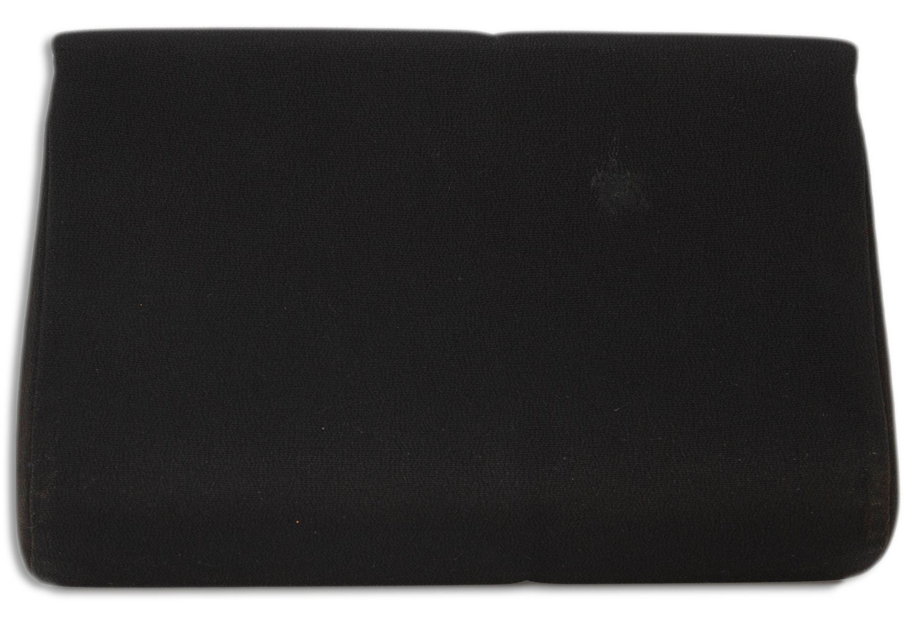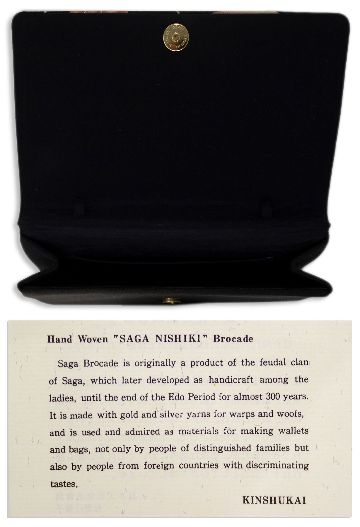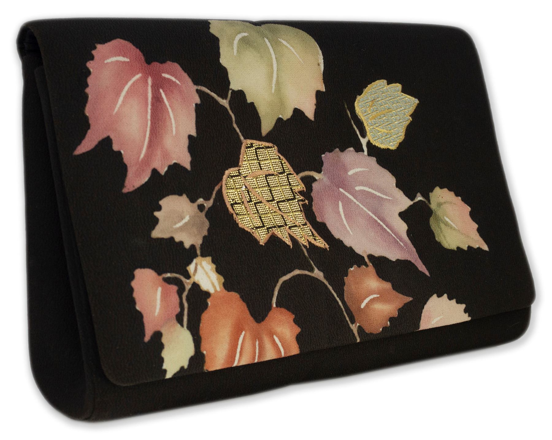 Evening clutch owned by the first woman to hold the office of Prime Minister of the United Kingdom, Margaret Thatcher. Black silk crepe clutch purse features a fall leaf design, with hand-woven Saga Nishiki brocade. Purse measures 9'' x 6'' x 2.5'' deep, with magnetic snap to close. Small spot of discoloration to back, otherwise near fine.