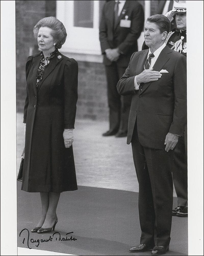Glossy 8 x 10 photo of Thatcher standing alongside Ronald Reagan, signed in black felt tip. In very fine condition.