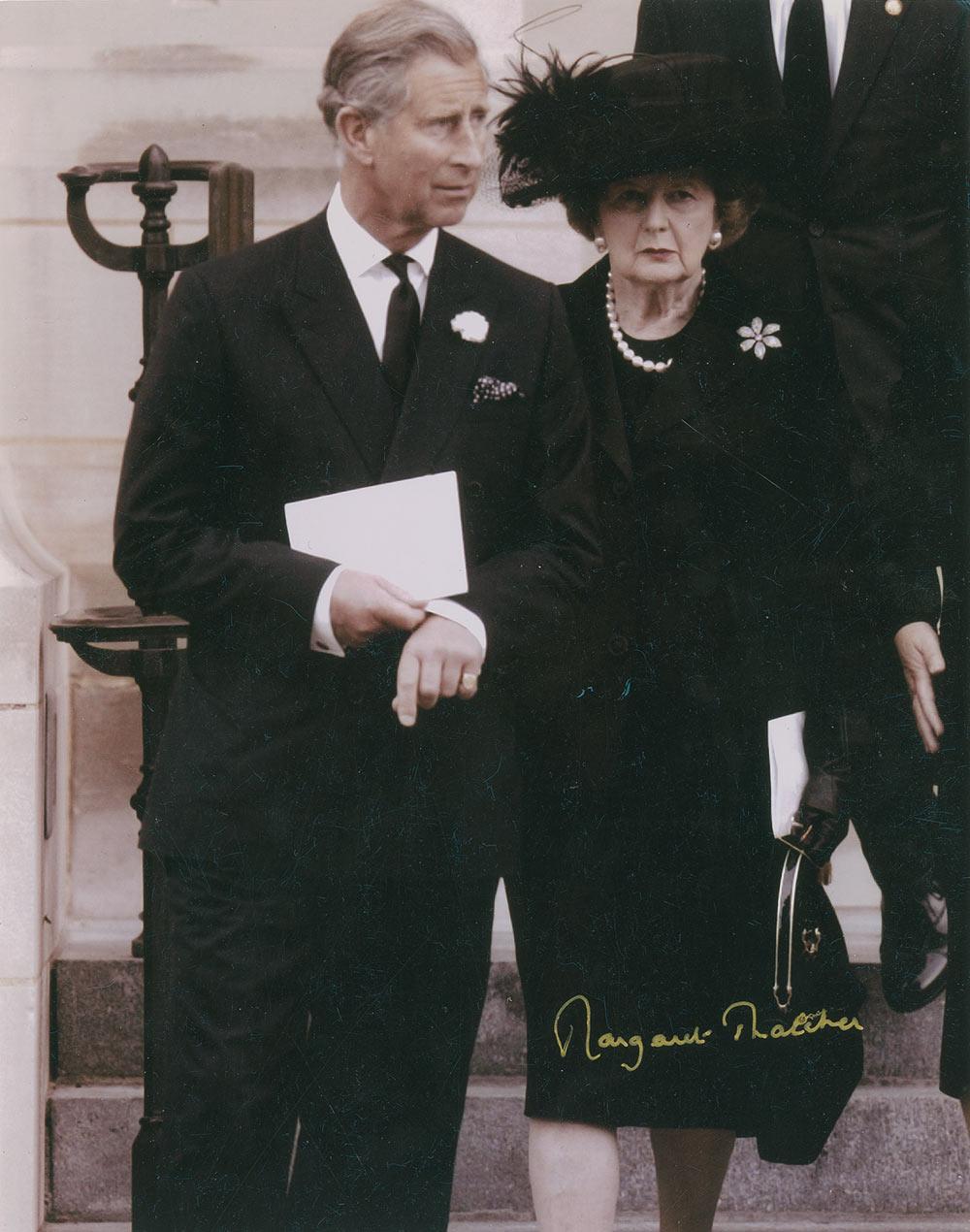 Color satin-finish 8 x 10 photo of Thatcher and Prince Charles, signed in gold ink by Thatcher. In fine condition, with a couple trivial blue ink marks to dark portion of image.