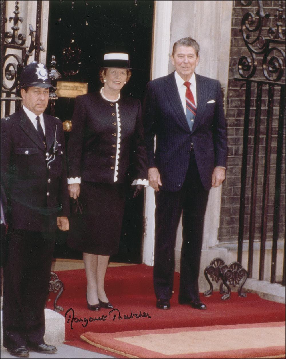 Color glossy 8 x 10 photo of Thatcher and Ronald Reagan outside 10 Downing Street, signed in black felt tip by Thatcher. In fine condition.