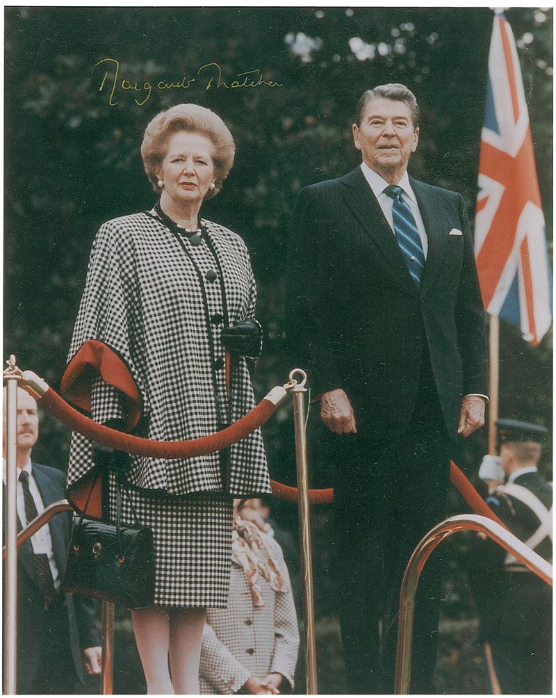 Color satin-finish 8 x 10 photo of Thatcher posing alongside Ronald Reagan at an official event, signed in gold ink. In fine condition.