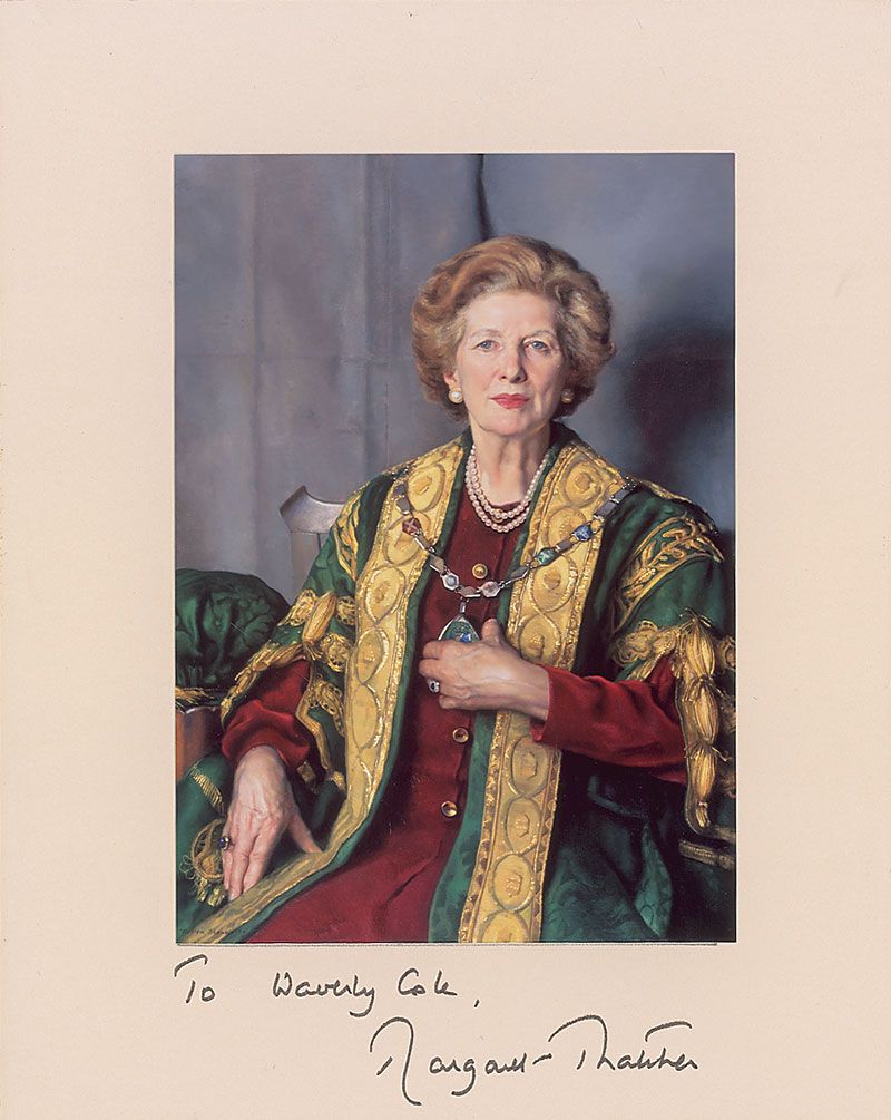 Distinguished color glossy 5 x 7 photo of Thatcher affixed to an 8 x 10 mount, signed and inscribed on the mount in black felt tip, “To Waverly Cole, Margaret Thatcher.” In fine condition.