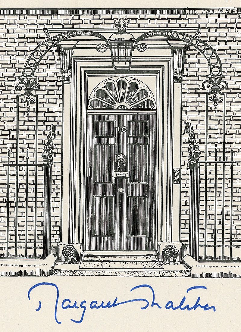 Off-white bookplate, 3.75 x 5, with an artist’s rendering of the front of 10 Downing Street, signed at the bottom in blue felt tip. In very fine condition.