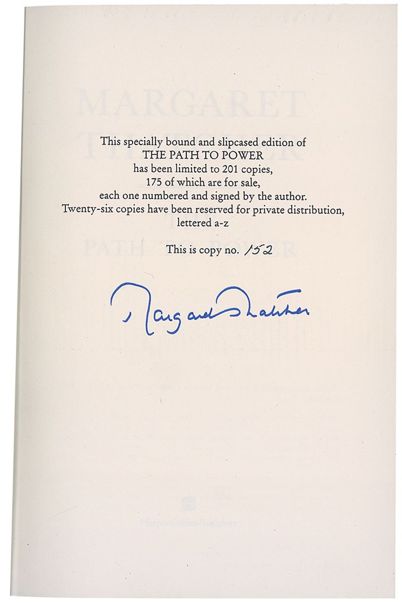 Signed book: Path to Power. Limited first US edition of 201 copies (this being No. 152). NY: HarperCollins, 1995. Hardcover with slipcase, 6.5 x 9.25, 656 pages. Signed on the colophon in blue ink. In fine condition, with a couple trivial spots to front cover.