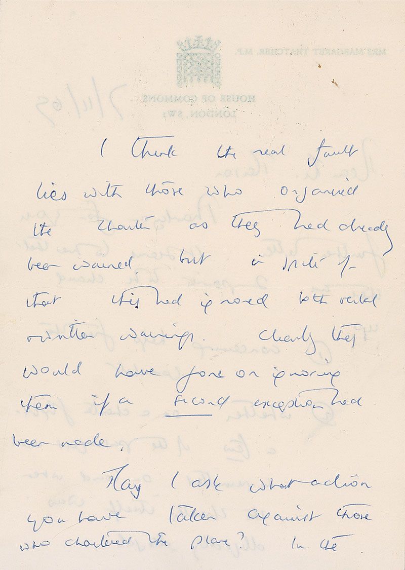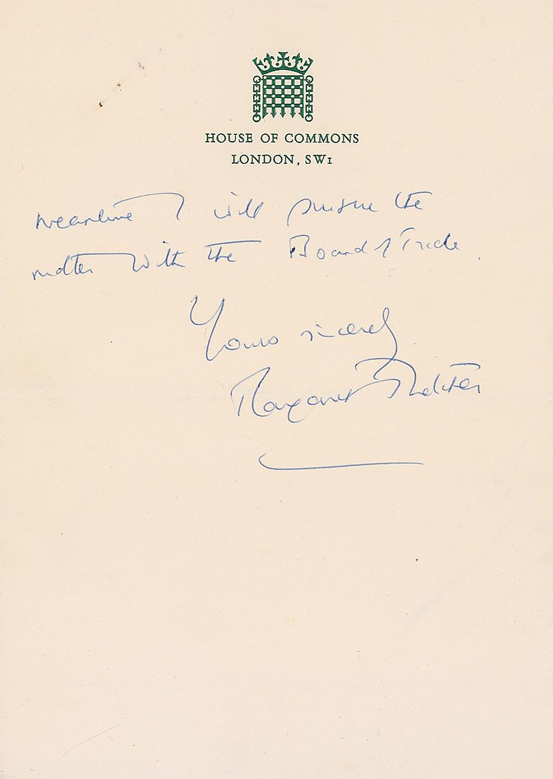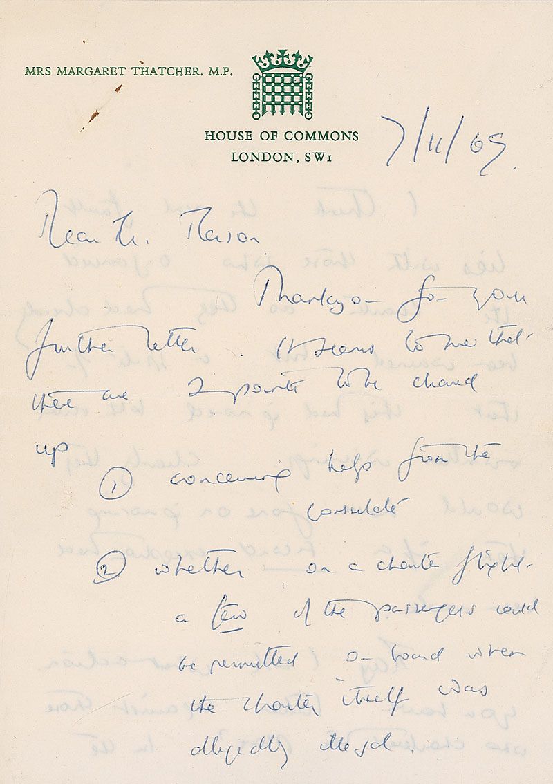 British politician (1925–2013) who was the Prime Minister of the United Kingdom from 1979 to 1990. Early ALS, three sides of two pages, 5.75 x 8, House of Commons letterhead, July 11, 1969. Letter addressing a complaint. In part: “It seems to me there are two points…concerning help from the consulate…Whether, on a charter flight, a few of the passengers could be permitted to board…I think the real fault lies with those who organized the charter as they had already been warned, but in spite of that they had ignored both verbal and written warnings. Clearly they would have gone on ignoring them if a second exception had been made.” In fine condition, with a rusty staple hole to top left corners.