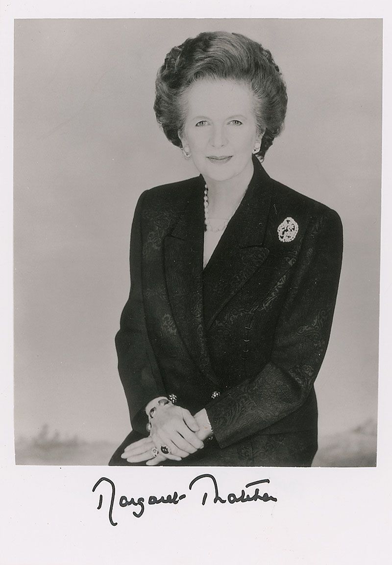 Distinguished satin-finish 5 x 7 photo of Thatcher, signed in the lower border in black felt tip. In fine condition.