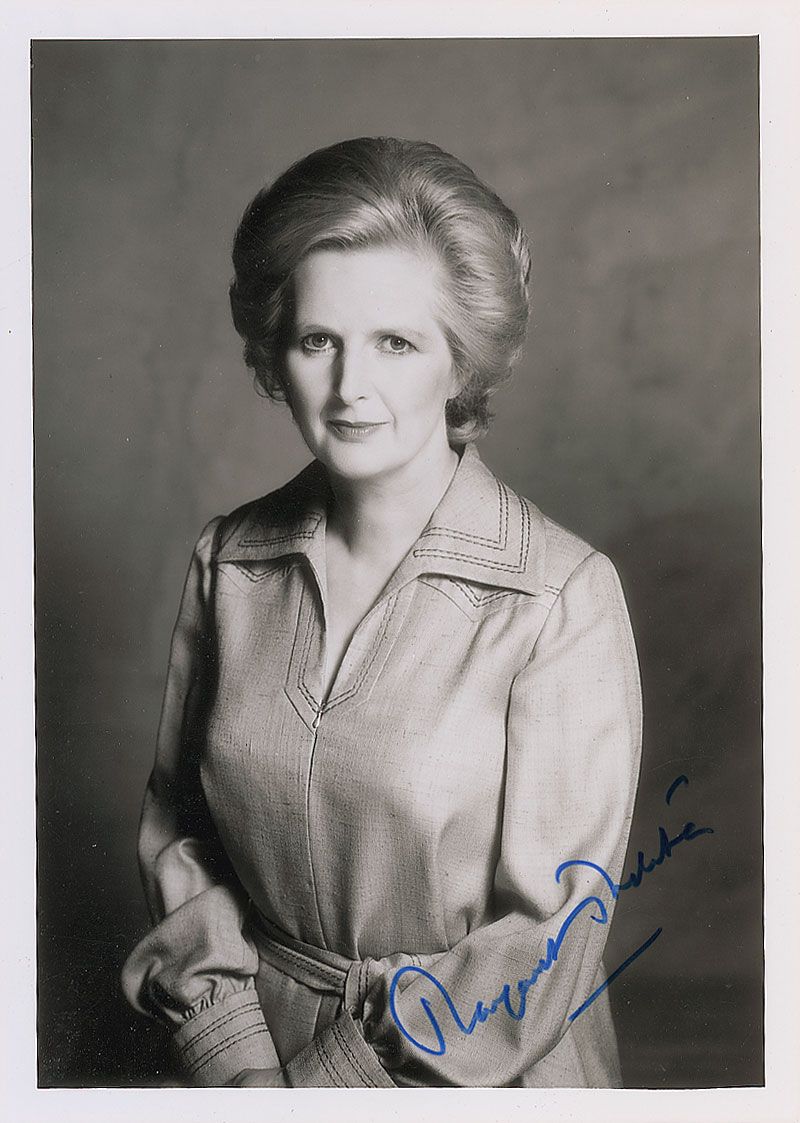 Glossy 5 x 7 half-length photo of Thatcher, signed in blue felt tip. In very fine condition.