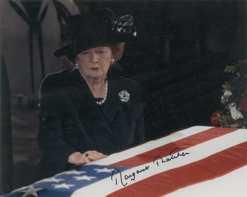 Color satin-finish 10 x 8 photo of Thatcher kneeling at Ronald Reagan’s flag-draped casket, signed in black felt tip. In very fine condition. Accompanied by a certificate of authenticity from James Spence.